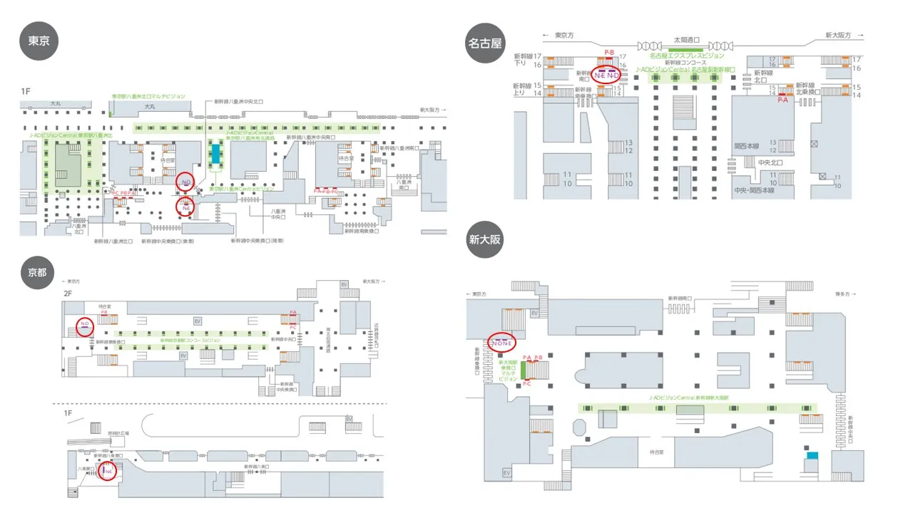 | 駅・エリア | 東京, 小田原, 静岡, 浜松, 名古屋, 京都, 新大阪, 新神戸, 岡山, 小倉, 博多 | 路線 | 東海道新幹線, 山陽新幹線 |