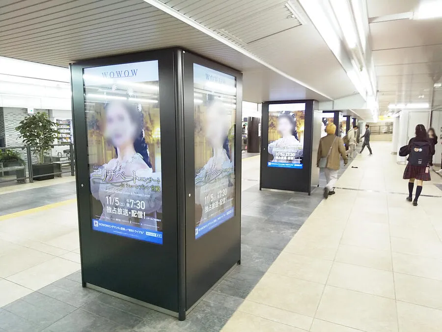 駅の柱をラッピングする広告です。4面を使って立体的に情報を発信できるため、非常に目立ち、空間をジャックしたような演出が可能です。通行人の記憶に残りやすく、ブランドイメージの向上に貢献します。