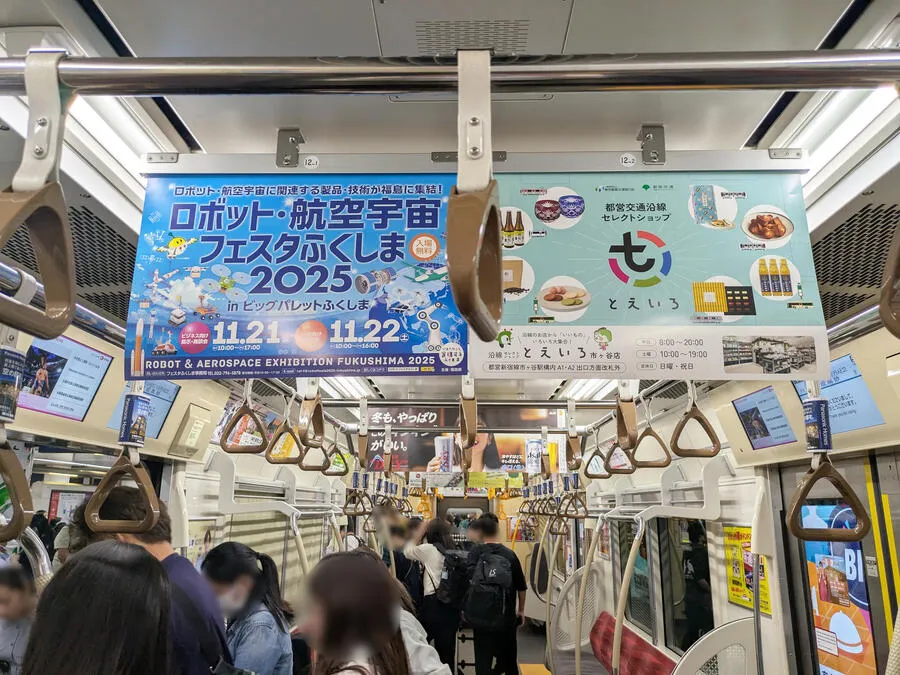 電車内の天井から吊り下げられるポスター広告です。車内で最も目立つ広告の一つであり、新商品やキャンペーンの告知など、短期的に強いインパクトを与えたい場合に適しています。多くの乗客の目に留まるため、認知度向上に高い効果が期待できます。