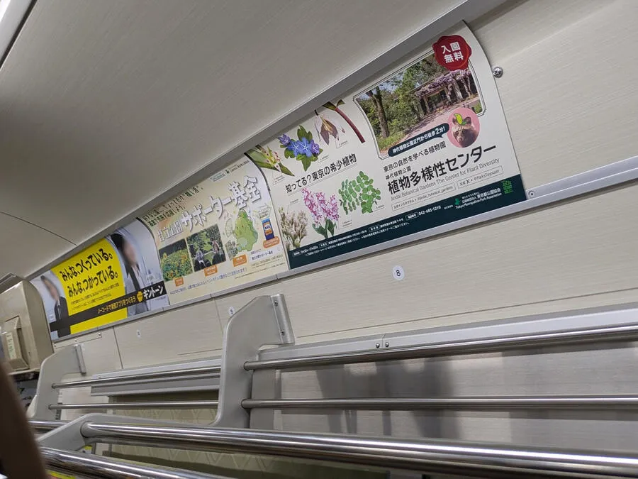 座席の上の窓部分に掲出されるポスター広告です。乗客の目線の高さにあり、比較的長い時間見てもらえる可能性が高い媒体です。他の広告に比べて掲出期間が長く設定されていることが多く、継続的な訴求に向いています。