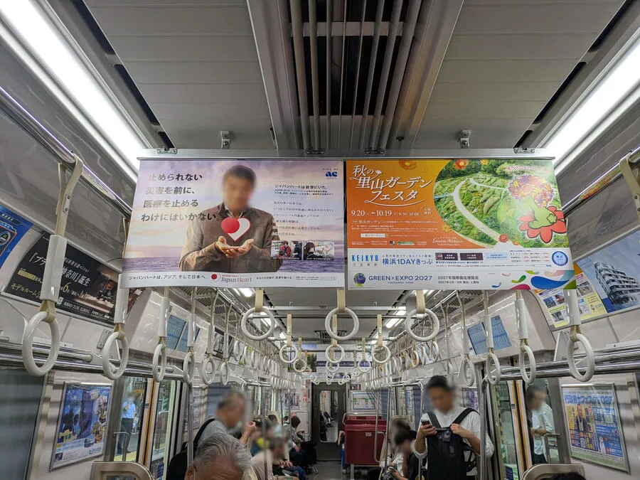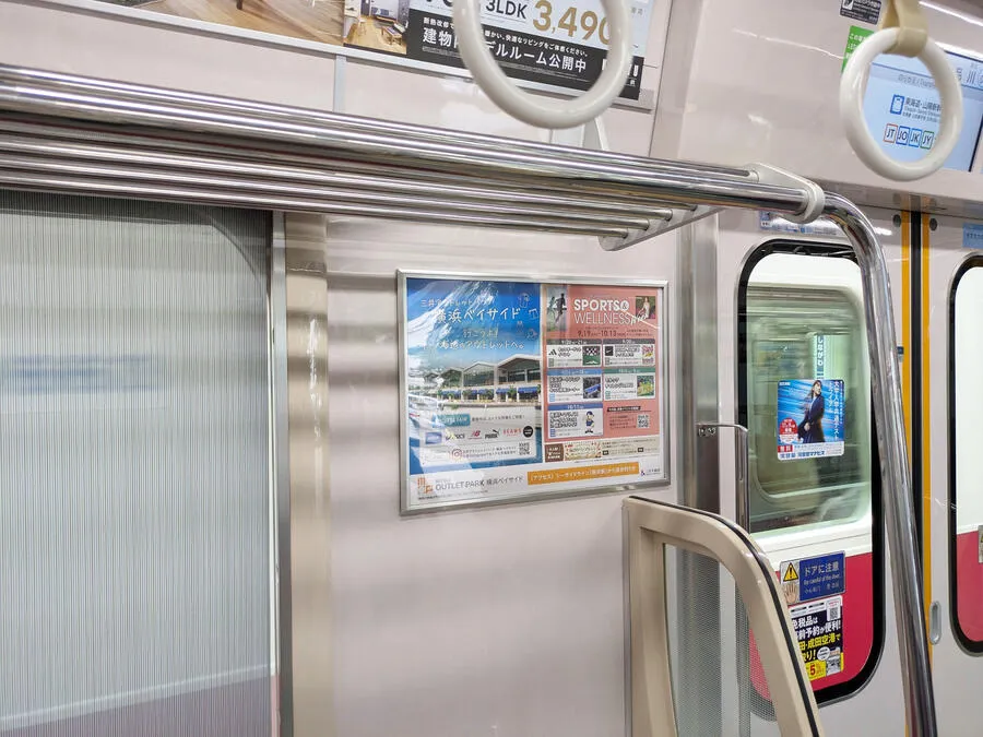 中吊り広告は、電車内中央の天井部分に設置される最も代表的な車内広告です。混雑した車内でも視認性が保たれる位置にあり、乗客の自然な視線を集めやすい広告メディアとなっています。乗車時間中に繰り返し目に入ることで高い記憶定着効果が期待できます。特に京急線は品川・羽田空港・横浜を結ぶ主要路線のため、ビジネスマンや空港利用者への効果的な情報発信が可能です。