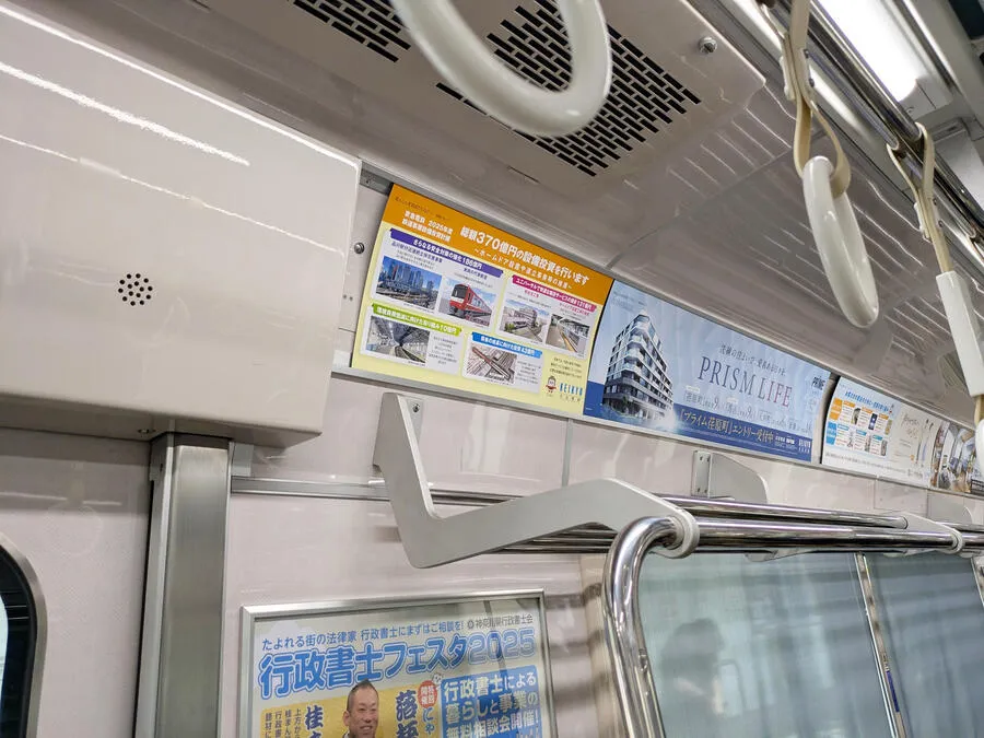 まど上広告は電車の窓上部に設置される広告で、座席に座った乗客から立っている乗客まで幅広い視野角から視認できる特徴があります。乗車時間が比較的長い京急線において、じっくりと内容を読んでもらえる媒体として人気があります。また、まど上広告の利点は他の車内広告と比較して掲出期間が長く、複数回利用する定期利用者への刷り込み効果が高いことです。詳細な商品・サービス情報を伝えたい場合に適しています。