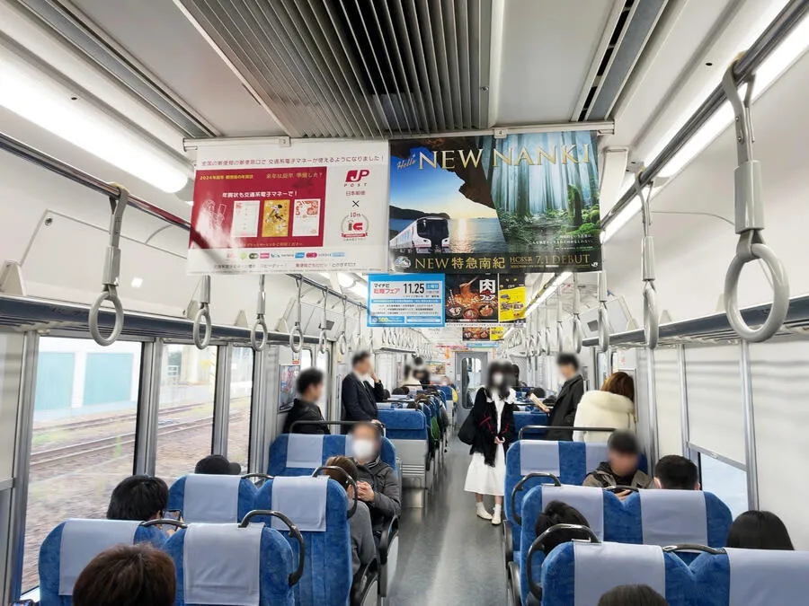 乗降ドアの横、乗客が乗り降りの際に必ず目にするスペースに掲出される広告です。駅での停車時間が広告との接触時間となり、乗り降りを待つ乗客の注目を集めます。視線が集まりやすい高さにあるため、QRコードを設置してWebサイトへ誘導するといった施策とも相性が良いです。