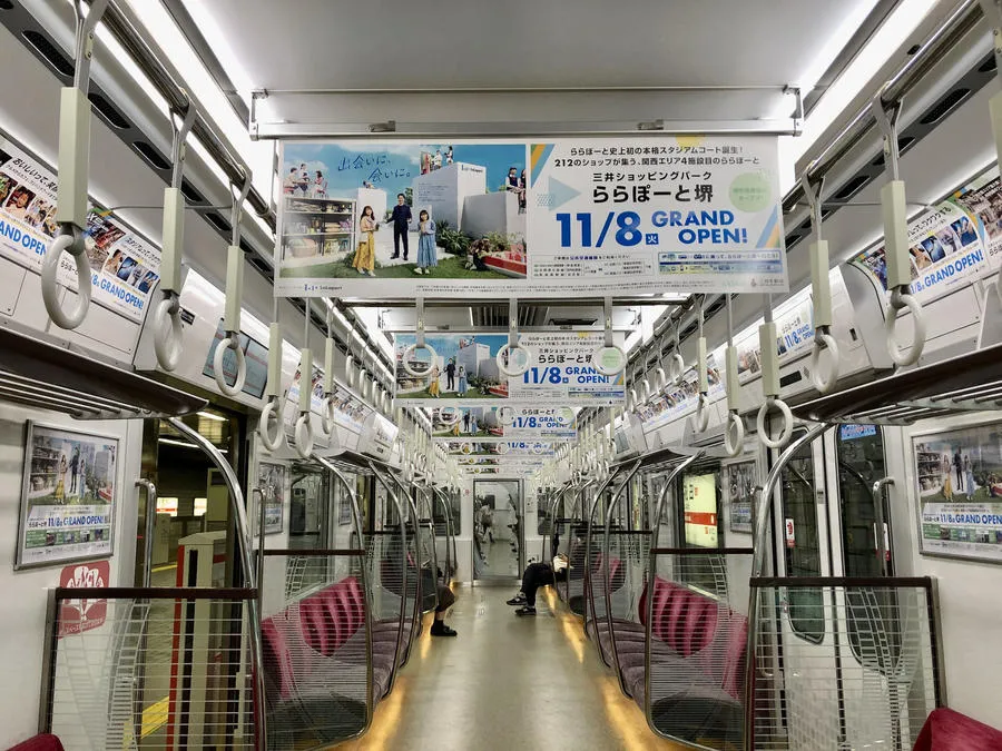 基本的に各車両に1枚掲出されるので、どの車両に乗っている人にもPRすることができます。また、電鉄によっては路線ごとに掲出を分けることができるので、狙いたいターゲットが利用している路線をめがけて出稿すると、ターゲットが利用する路線で1つの車両に1枚掲出されているので効果的に広告内容を届けることができます。