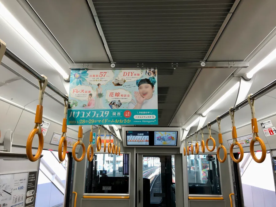 例えば上の写真のようにOsaka Metroなどでは車内広告をジャックして使う方法があり、非常にインパクトがあります。さらに、伝えたい情報も多く載せることができます。