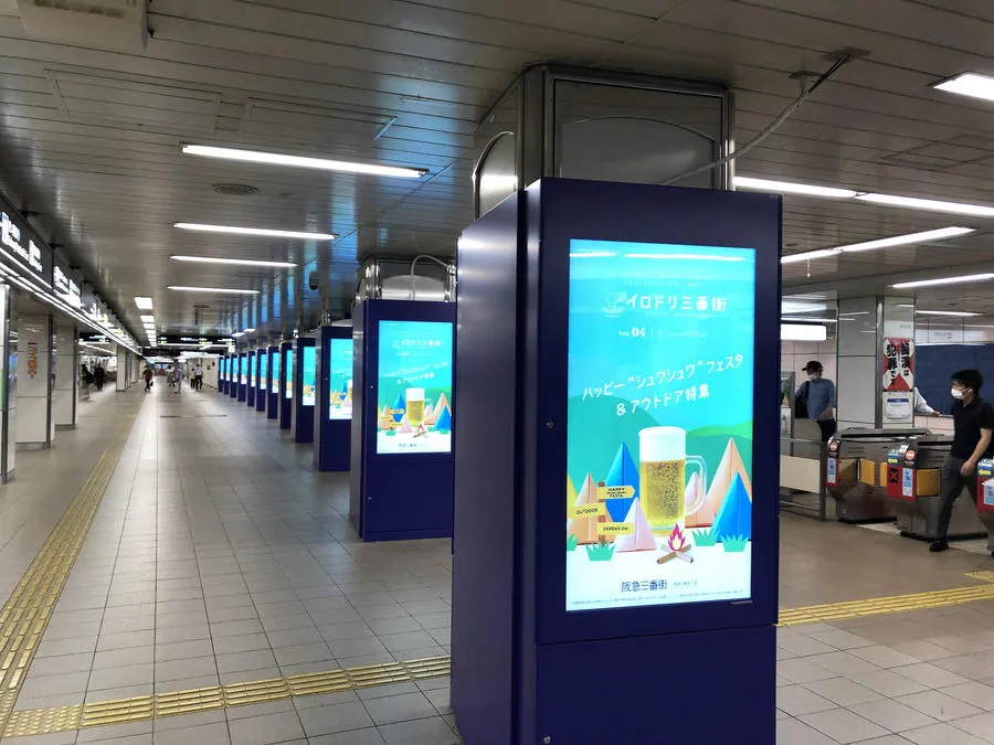 東梅田駅の改札前の通路の14本の柱に設置されています。面数は28面となっており、柱同士の間隔もあまり広くないので、広告面が並ぶと非常にインパクトがあります。駅へ向かう人、駅から他線への乗り換えや、ホワイティ梅田・阪急百貨店等の商業施設へ移動する人など多くの人にPRすることができるデジタルサイネージとなっています。