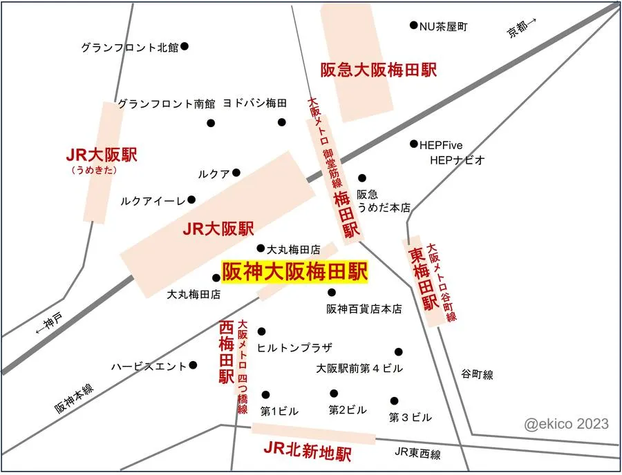 大阪・梅田エリアは、JR大阪駅・北新地駅、阪神大阪梅田駅・阪急大阪梅田駅、大阪メトロ梅田駅・東梅田駅 ・西梅田駅の7つの駅が集約されている、日本最大級のターミナル駅です。その中で阪神大阪梅田駅は大阪メトロ御堂筋線・四つ橋線・谷町線、JR大阪駅・北新地駅に囲まれています。そのため、各所への乗り換えが便利です。