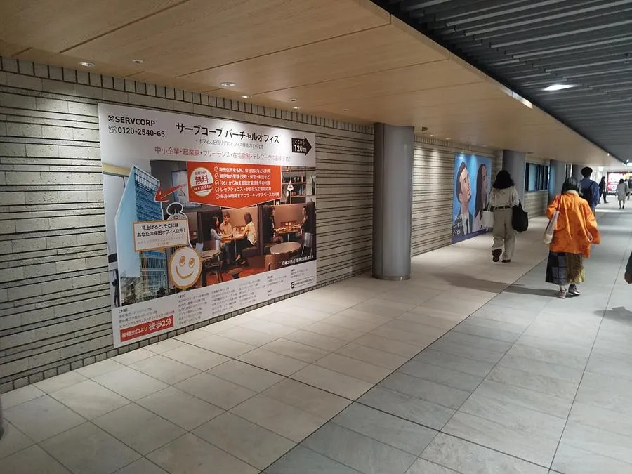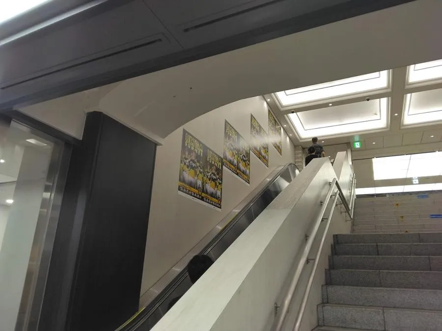 阪神百貨店の横の通路の壁面に掲出できます。B0ポスター×8枚が2ヶ所並ぶ形で掲出されます。通路の人通りは非常に多く、西梅田方面に向かう人、JR大阪駅に向かう人など様々です。そんな通路に大型サイズのポスターが掲出でき、通路自体も新しく、広告の見え方も綺麗なので、おすすめの広告媒体です。こちらは1週間単位で掲出できるので、イベント告知にはうってつけです。