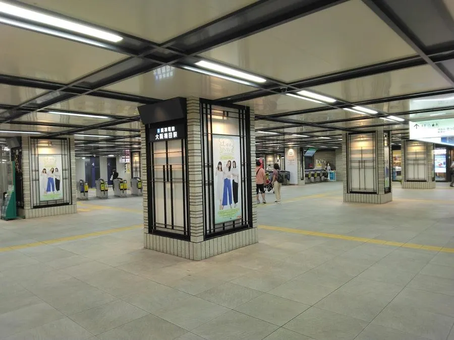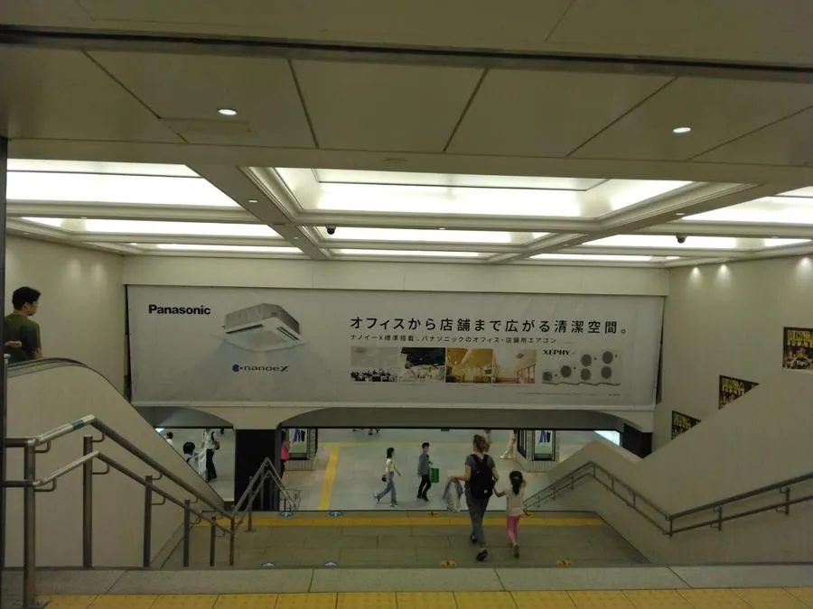 改札を出てすぐのエスカレーター壁面に設置されています。大阪メトロ御堂筋線・谷町線や阪急百貨店等の施設に向かう際に通る階段で、朝の通勤時間帯はエスカレーターを使う人で非常に混雑します。B0ポスターが4枚並び(B1ポスターも可:8枚分)、エスカレーターを乗る人からすると目線の高さにあるので見やすいです。