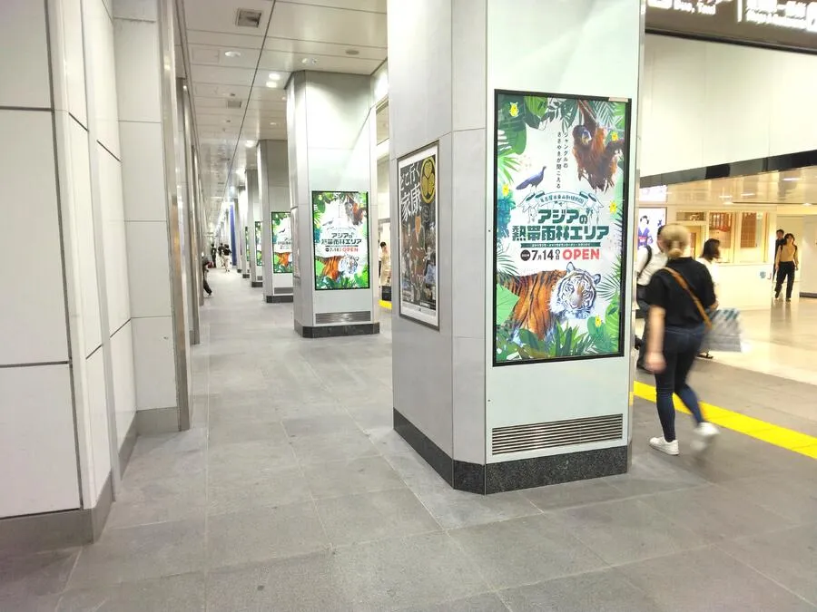 コンコースの柱にシートを巻く柱巻広告(アドピラー広告)は通路に連続して設置されていることが多く、ジャック感を演出できます。
