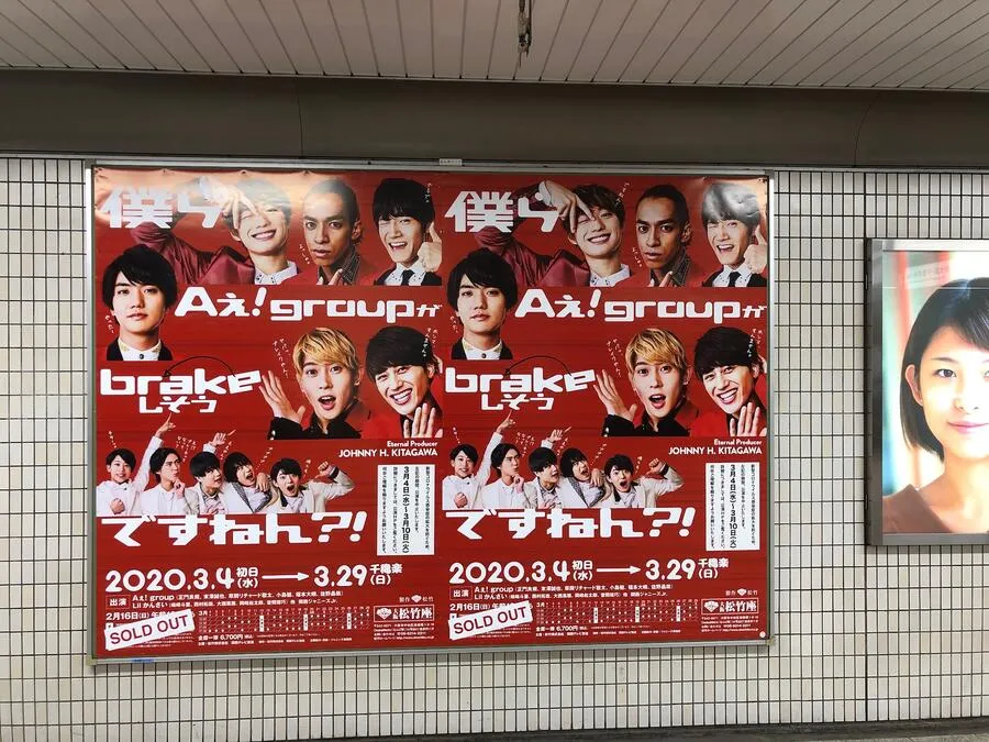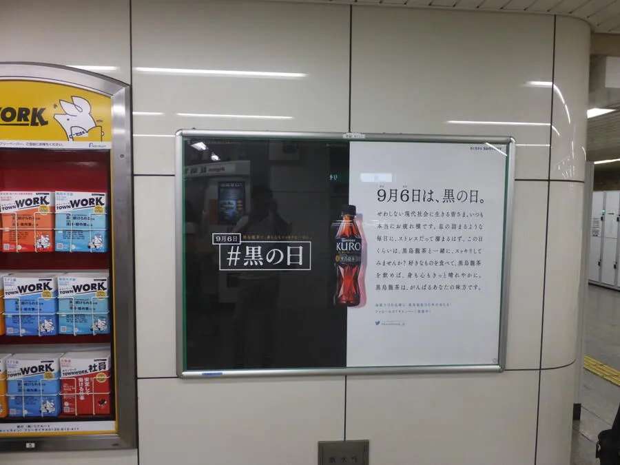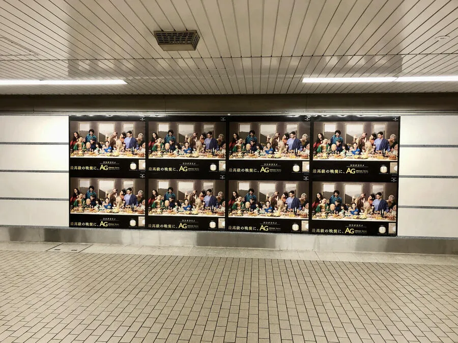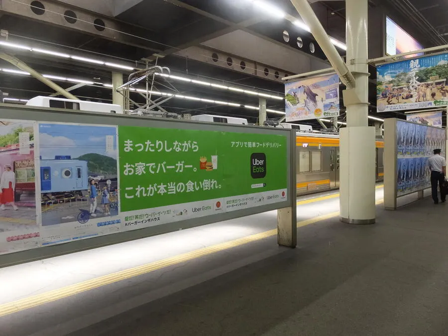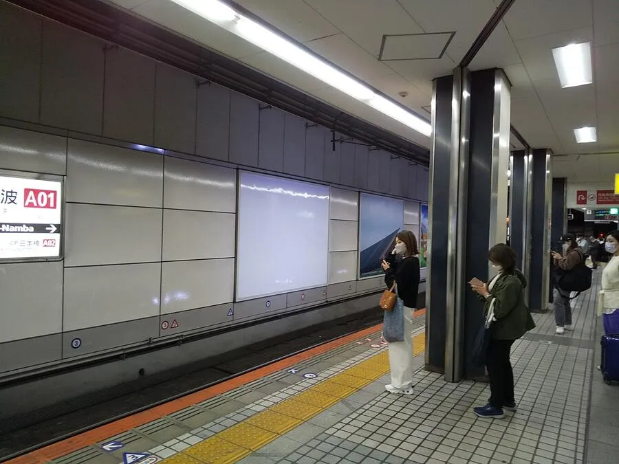 御堂筋線なんば駅の上りホーム壁面に設置されている大型ポスター広告です。