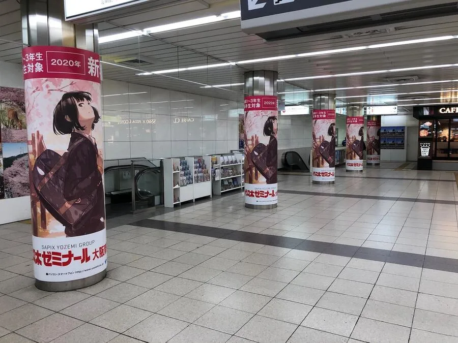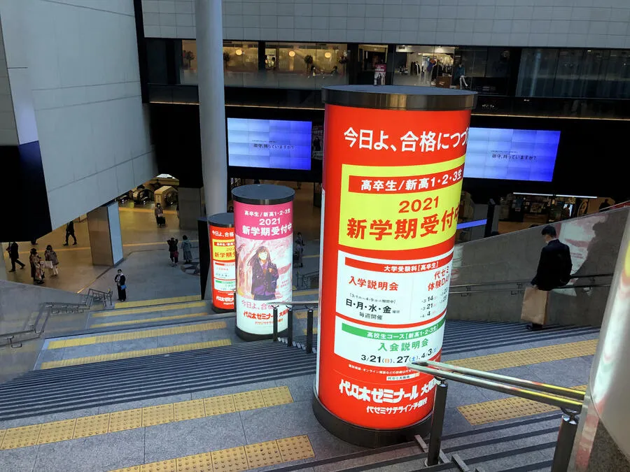 近鉄大阪難波駅の東改札内コンコースに設置されている円柱広告です。