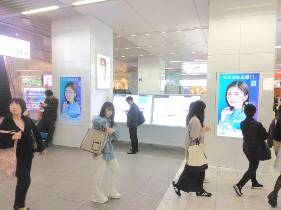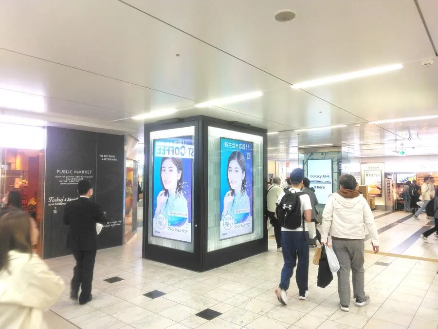 福岡地下鉄の博多駅(博多口)の駅コンコースに設置された駅デジタルサイネージ広告です。8柱15面で集中掲出感のある広告です。