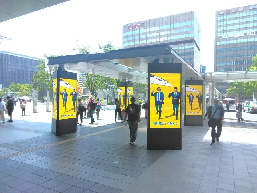 JR博多駅の博多口の駅前広場に設置された縦型サイネージです。三角柱の3面に設置されているので、全方向に訴求できます。駅周辺のオフィス街やタクシー乗り場、バス乗り場などを訪れる駅利用者に向けた訴求に適します。