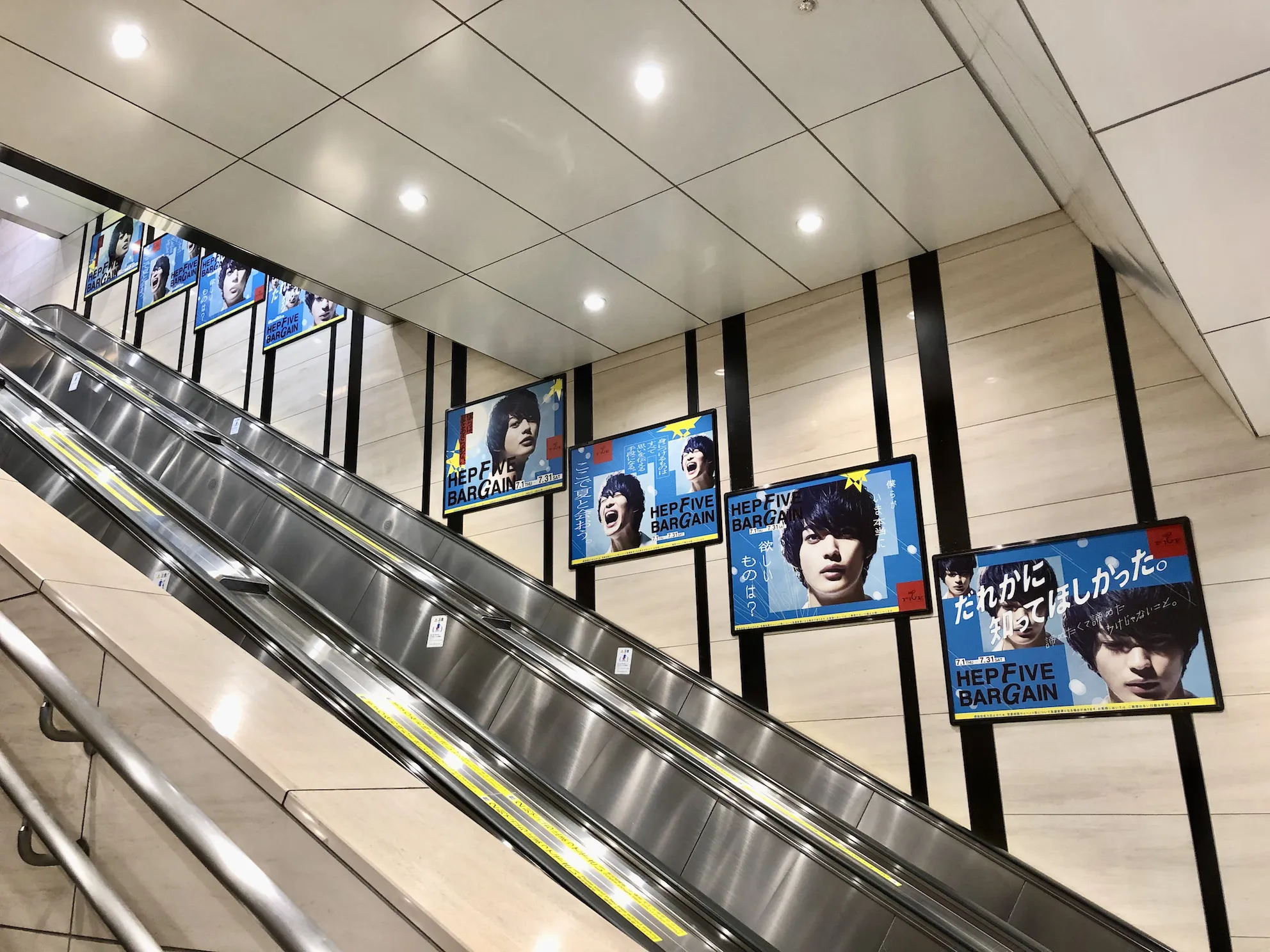 若手俳優の神尾楓珠さんを起用し、青色の爽やかなビジュアルになっています。こちらは、写真の阪急百貨店前の広場や阪急大阪梅田駅へと向かうエスカレーターの横、その他にOsaka Metro(大阪メトロ)御堂筋線の車内ビジョンに掲出されていました。媒体の近くに施設が立地しているので、「HEPに行ってみよう。」という行動を促せたり、HEP向かっている人も、ワクワクしますよね。