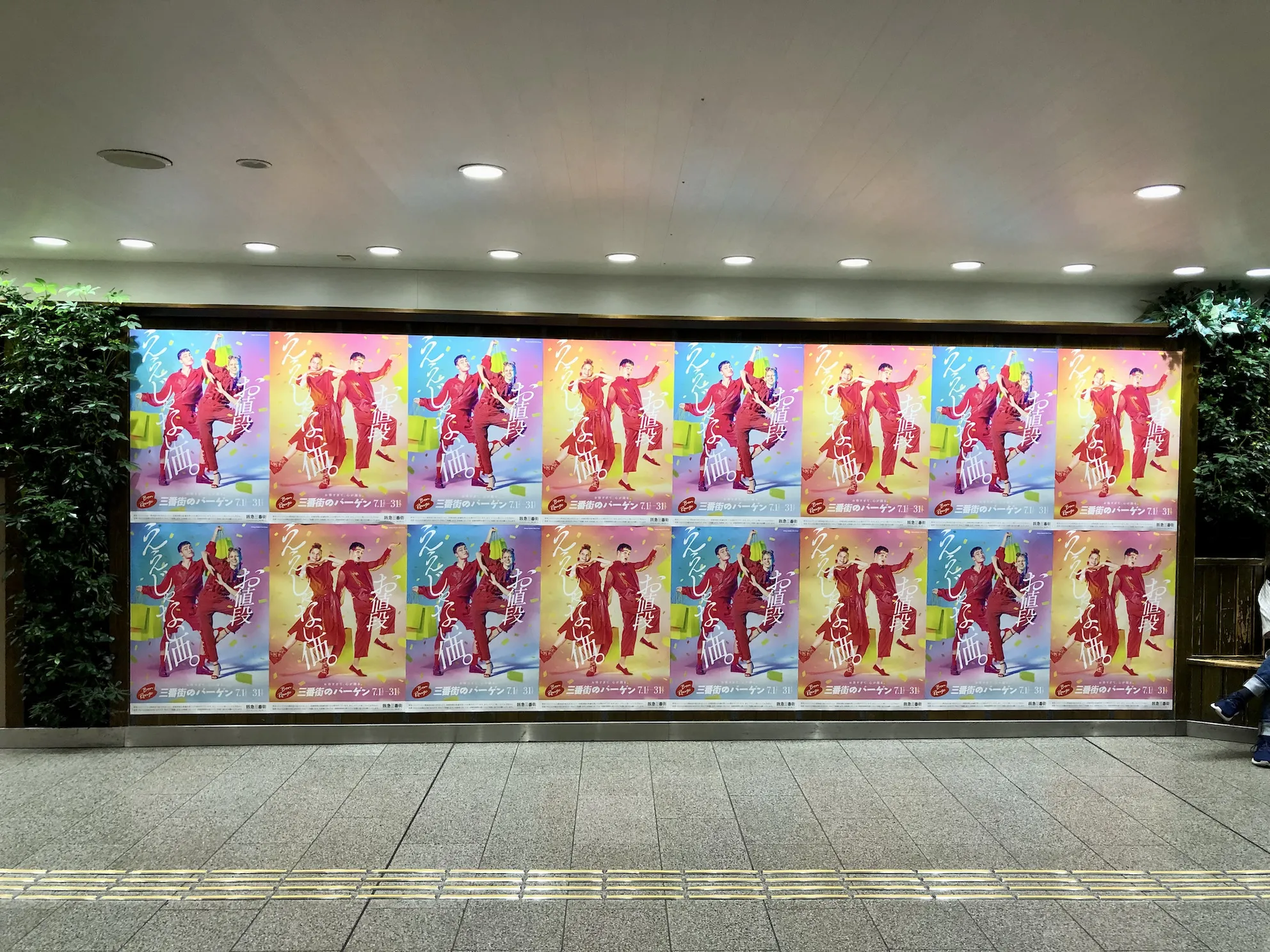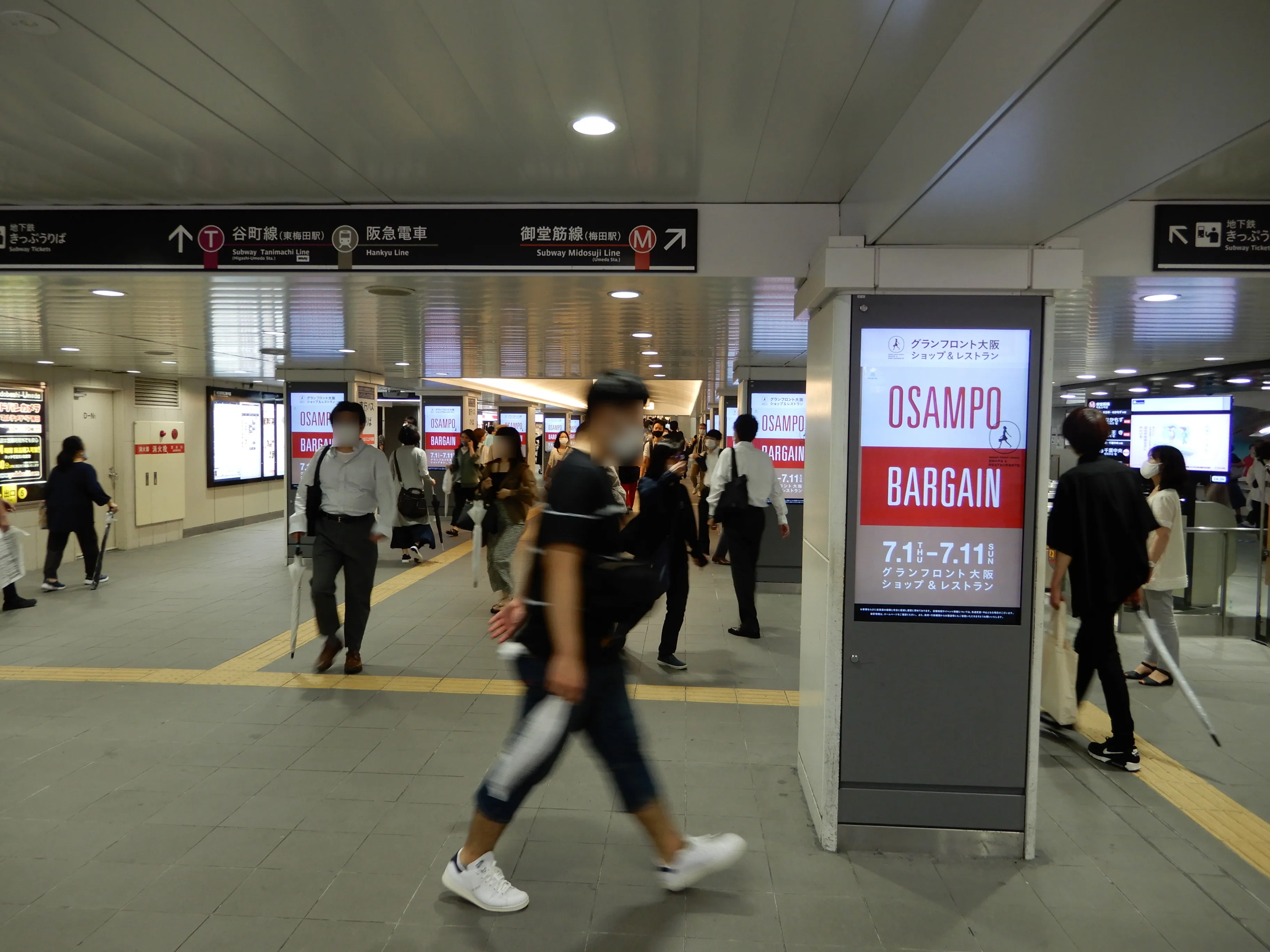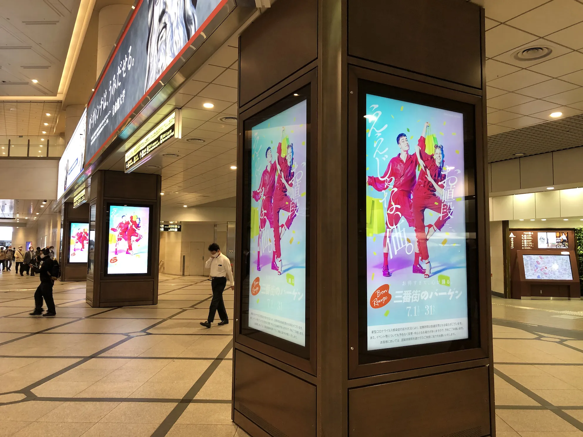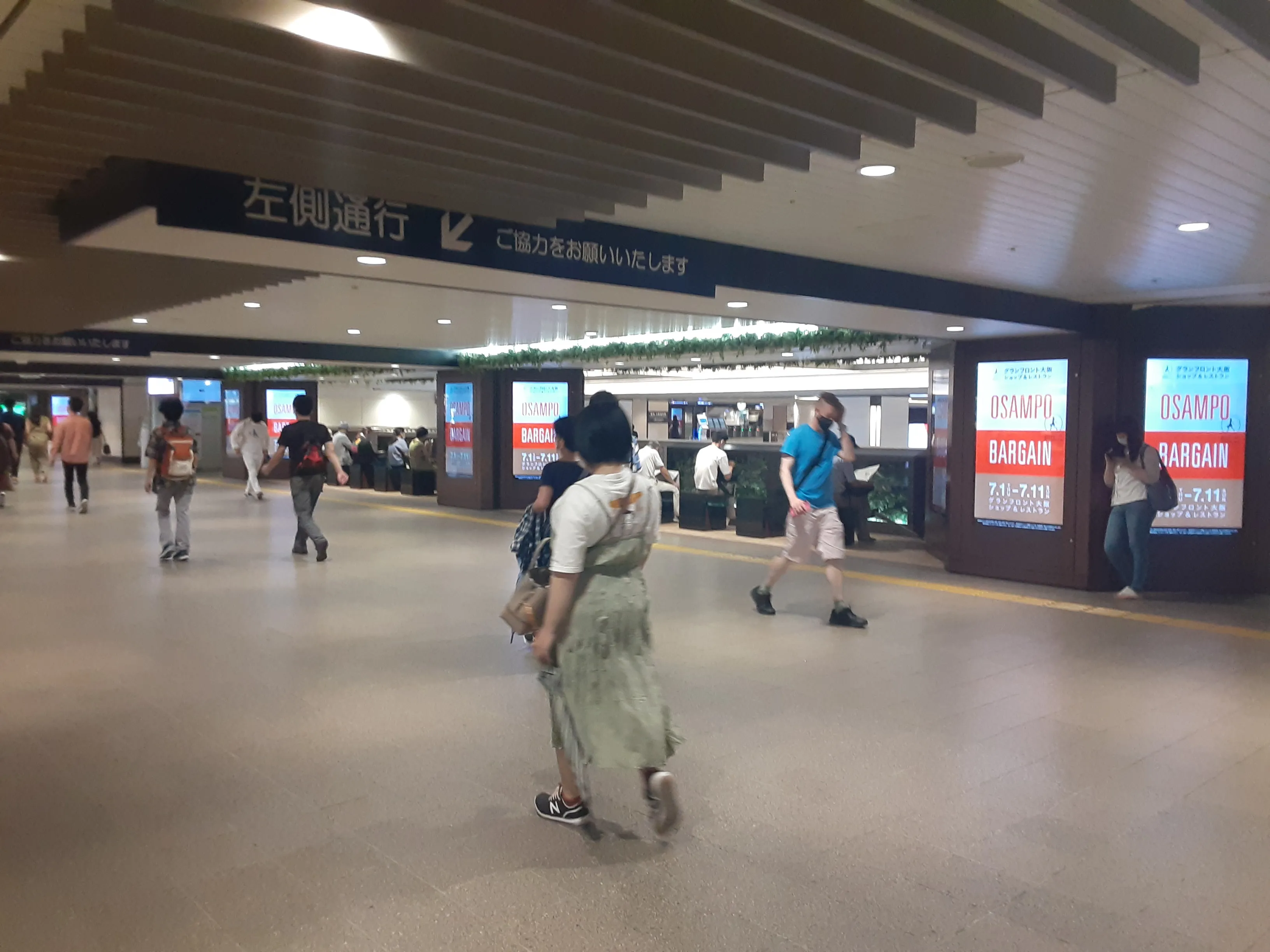 OSAMPO BARGAIN(お散歩バーゲン)と銘打って駅に広告を出しています。毎年バーゲンの時期は「OSAMPO BARGAIN」と称して開催されており、今回は赤と白のシンプルなビジュアルになっています。Osaka Metro(大阪メトロ)梅田駅・阪急大阪梅田駅のコンコースに掲出されていました。改札付近など、サイネージは人通りが多い所を中心に設置されているので、多くの人にPRしたいときにはピッタリです。
