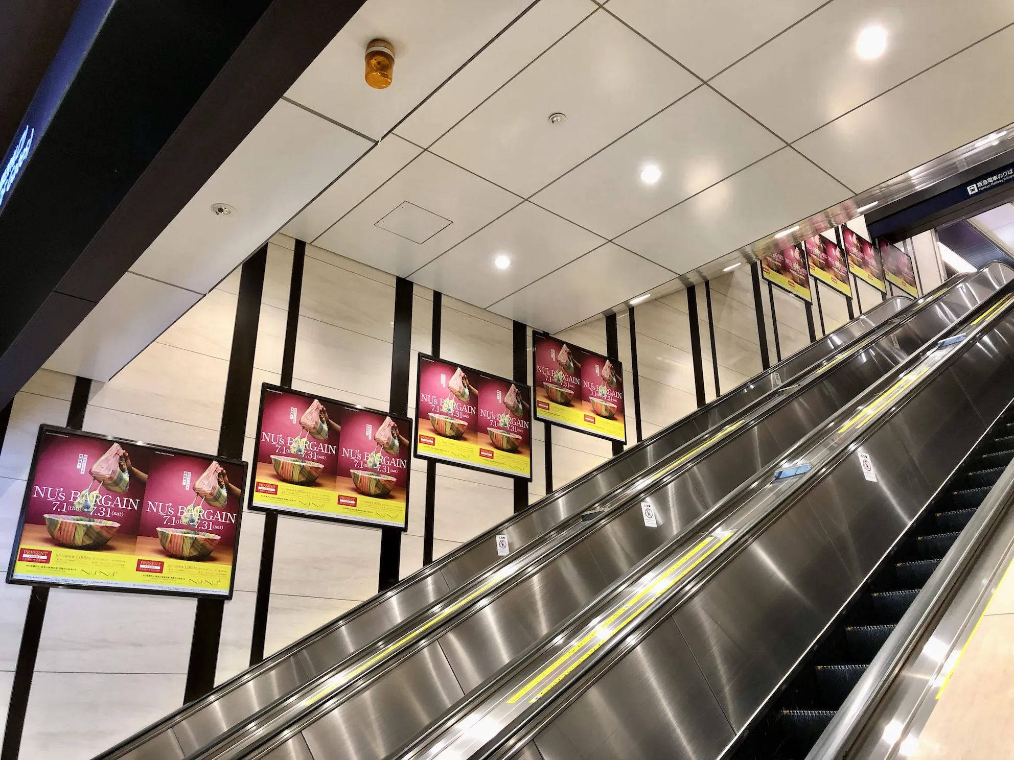 サイネージや階段壁面に複数掲出することで、多くの人にPRできます。また、施設の近くの媒体に掲出していることが多く、見ている人の行動を促すことができる効果があります。駅の近くにお店や会社がある方!告知をする際はぜひ、最寄りの駅での広告をご検討ください!お待ちしております。