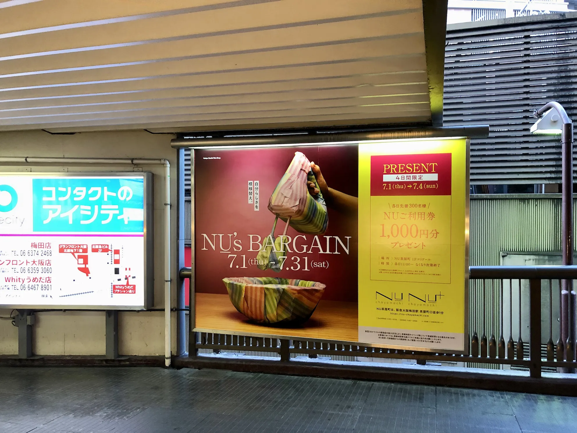 NU茶屋町もバーゲン告知を行っています。阪急大阪梅田駅のエスカレーター横や、ルクア・ヨドバシカメラと駅をつなぐ通路に掲出されていました。集中的な掲出や、大きいサイズでの掲出によって、インパクトのあるPRになっています。