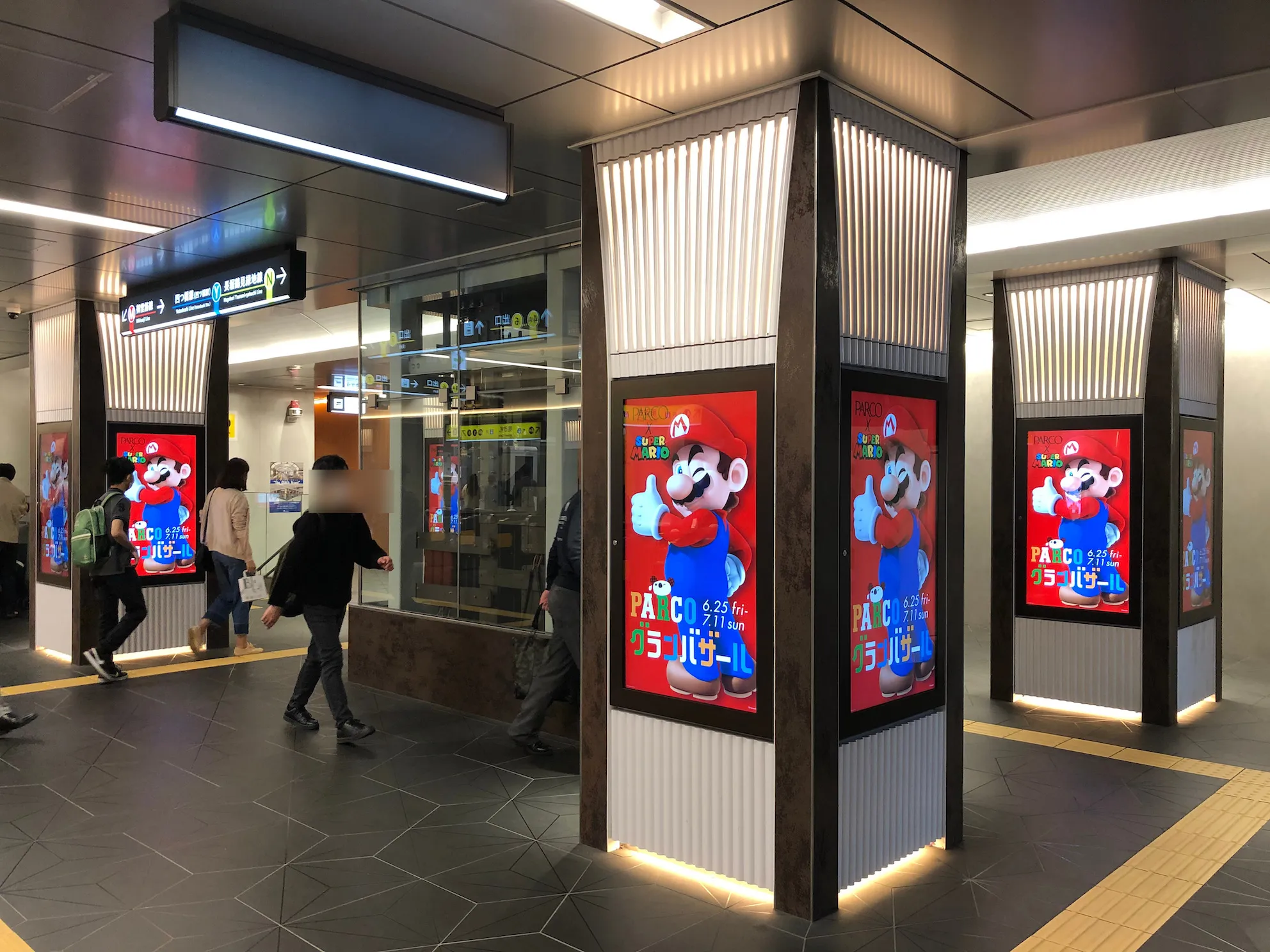 こちらはパルコの最寄り駅である、心斎橋駅のサイネージに掲出されており、駅を降りた人を迎えてくれるように見えます。また、改札周辺は待ち合わせ場所として利用する人もいるので、広告への接触時間も長くなり、繰り返しPRできるという特徴があります。