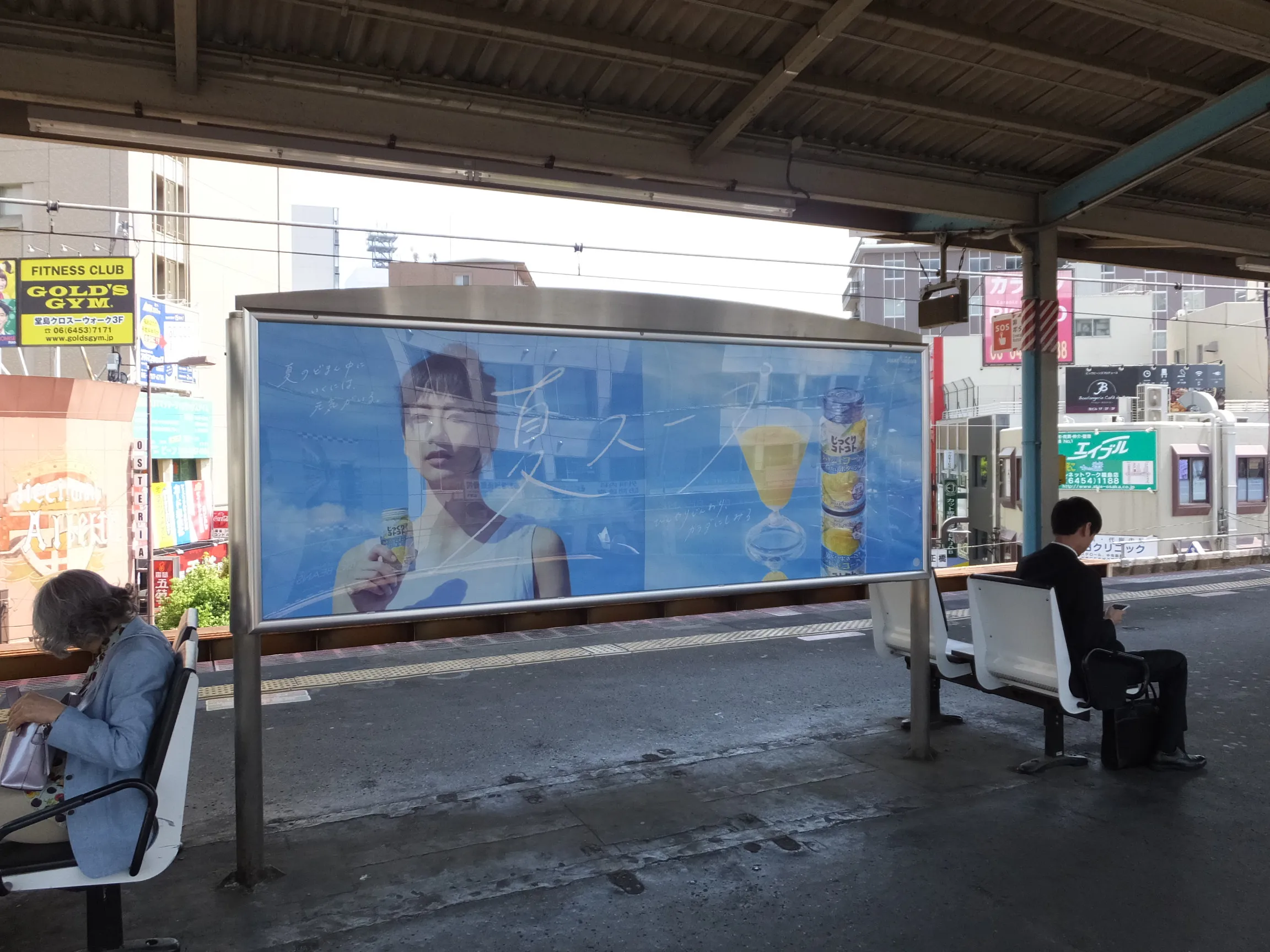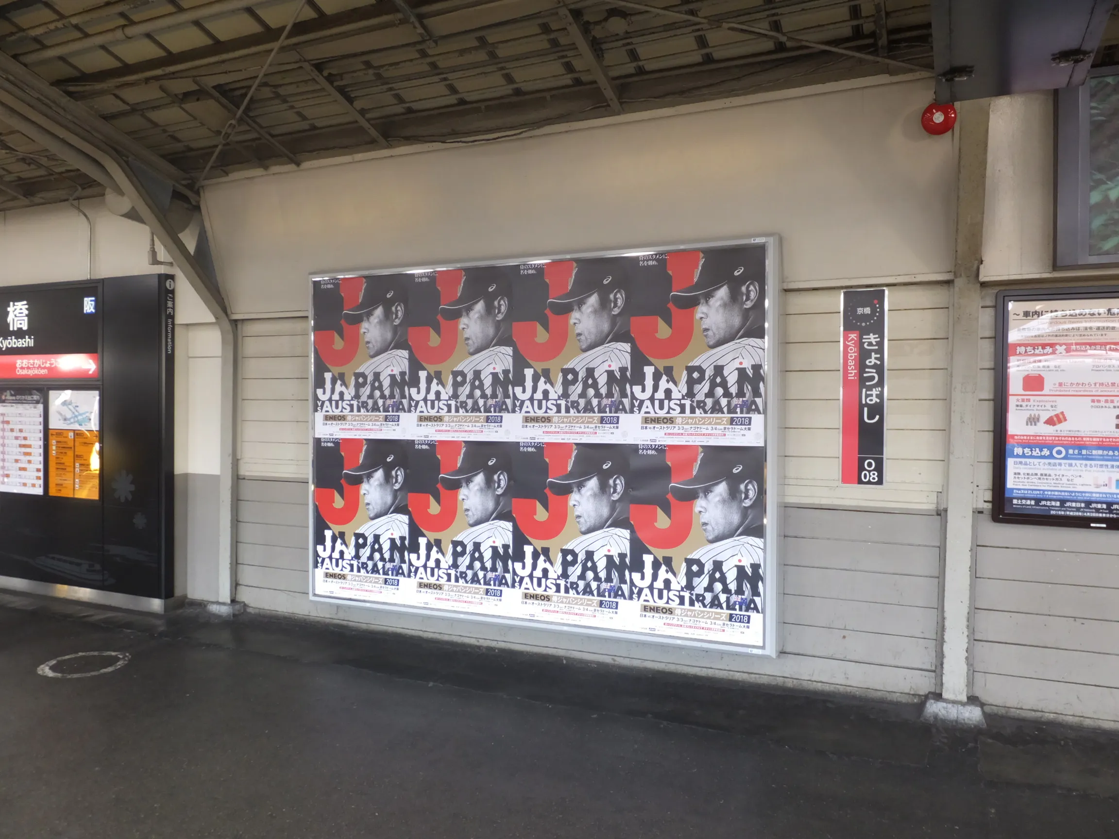 京橋駅の外回り(鶴橋方面)ホームに設置されている大型ポスターで、JR東西線・学研都市線への乗換え利用者に対しても効果的です。