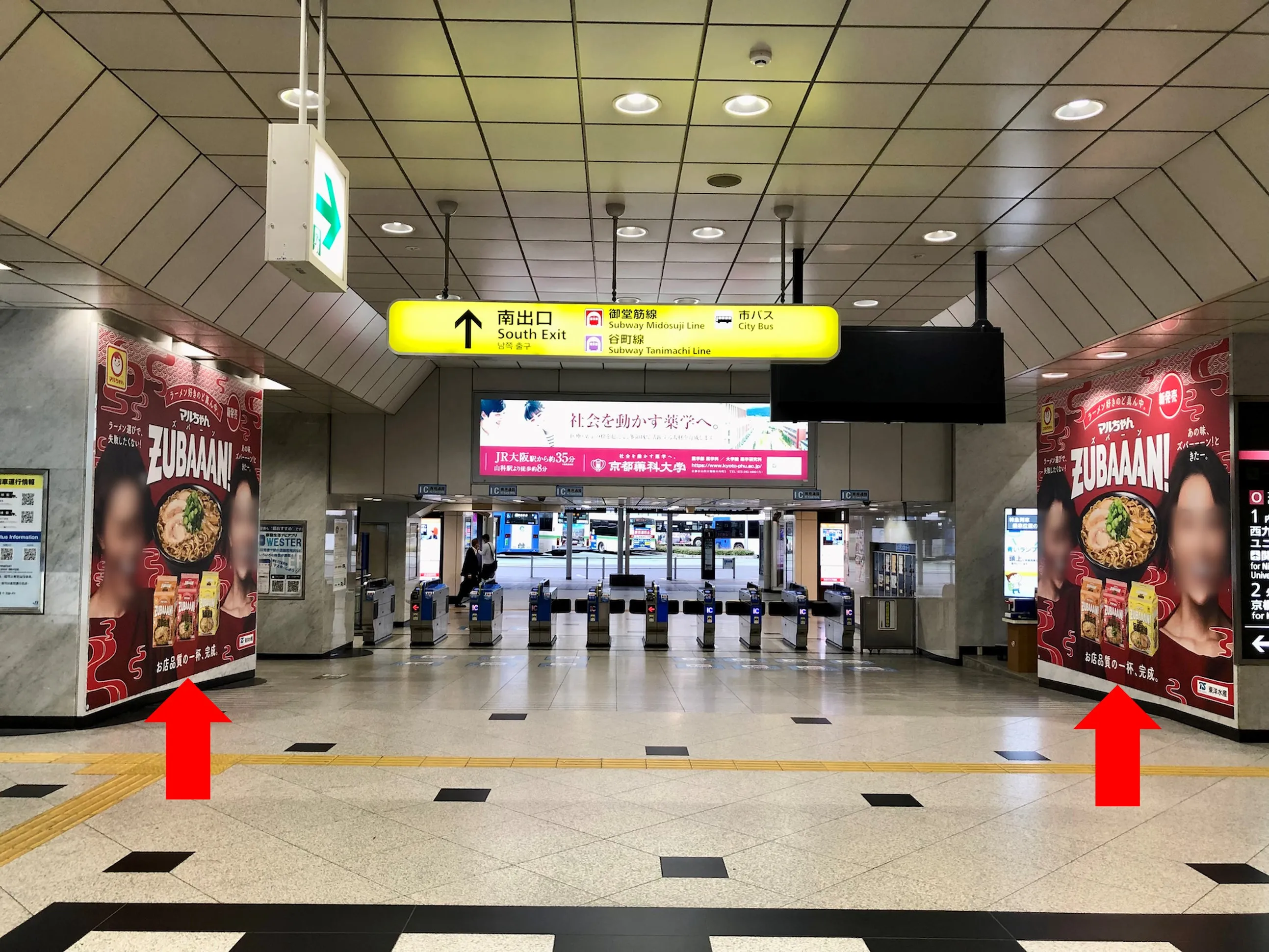 大阪駅南口改札付近の左右の壁面に掲出が可能な広告媒体です。Osaka Metroへの乗換え利用者にも有効です。
