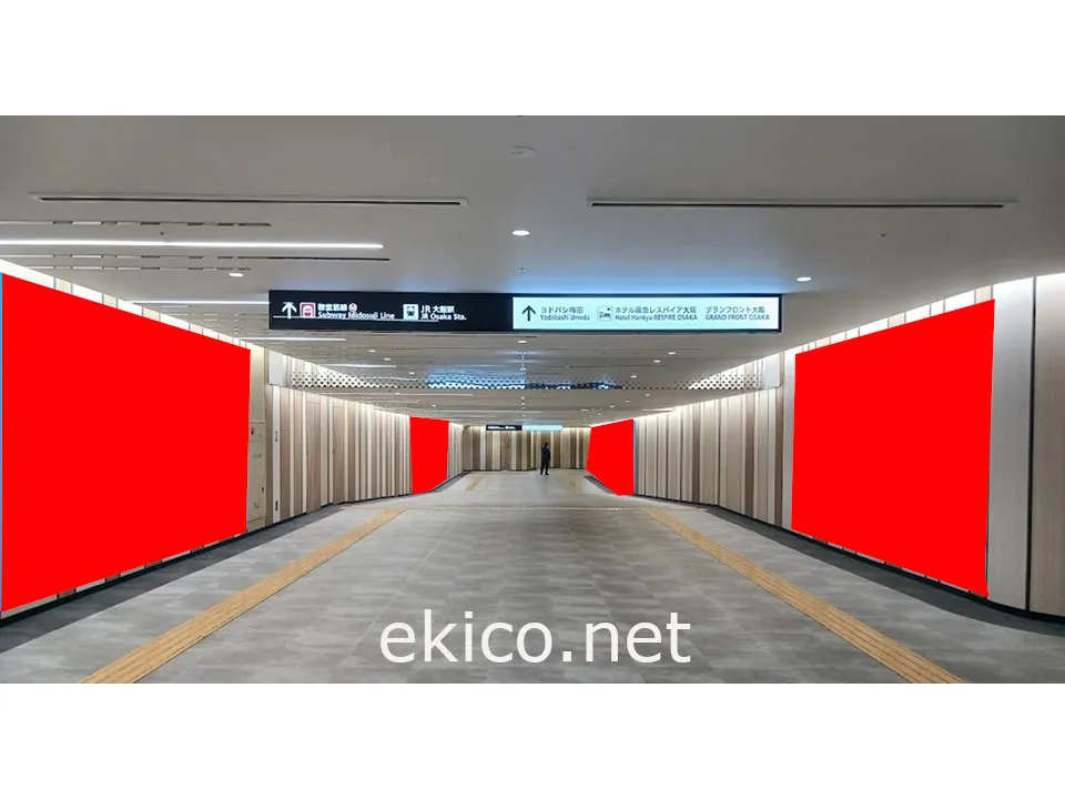 阪急大阪梅田駅とOsaka Metro御堂筋線梅田駅・JR大阪駅などを結ぶ阪急三番街南館B1階通路にジャック展開ができる大型シート広告です。朝夕ラッシュ時はもちろん、常に人通りが多い場所で、訴求力のある広告です。