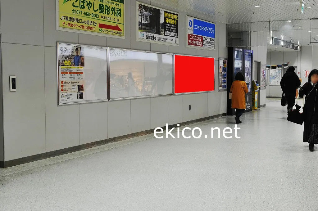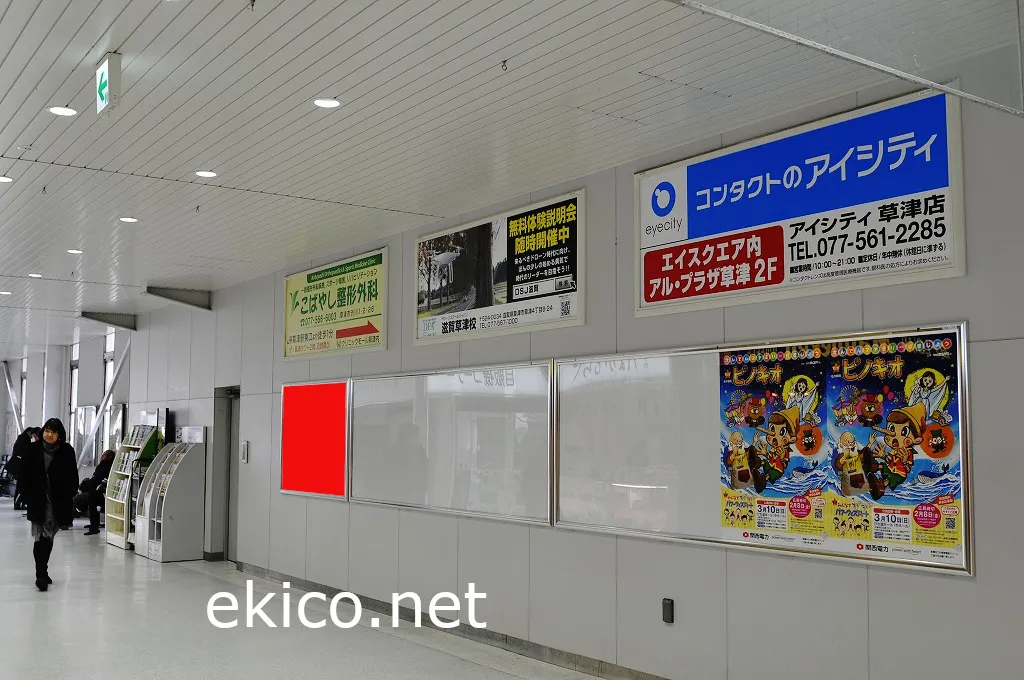 JR草津駅の改札外のコンコース壁面にポスターは掲出されます。1枚・7日間単位で、構内の目を引く場所にポスターを掲出できます。