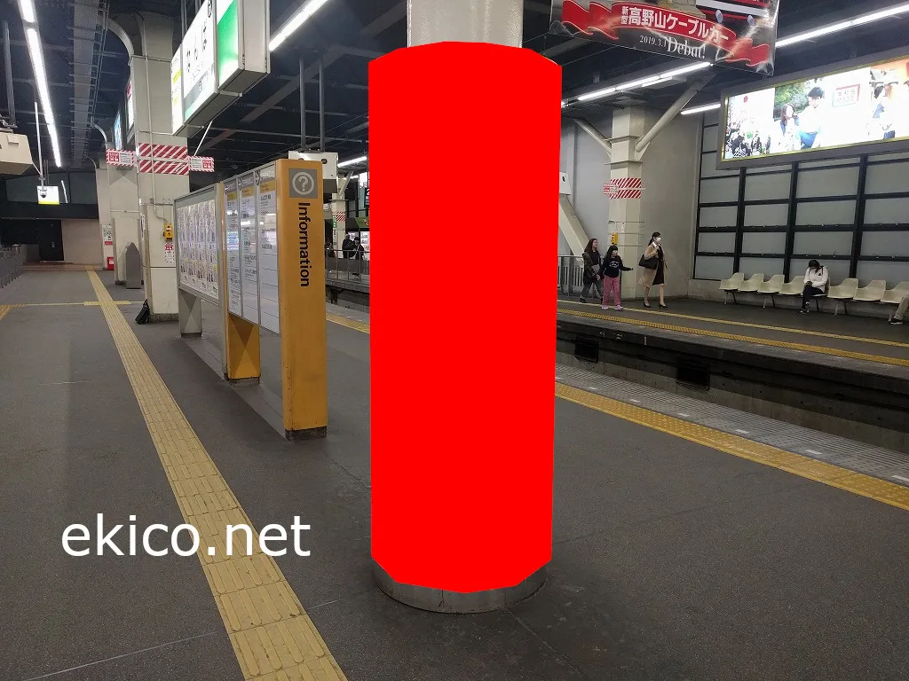 南海なんば駅の降車ホームのフラッグ掲出の円柱を利用した媒体でインパクトのある広告です。