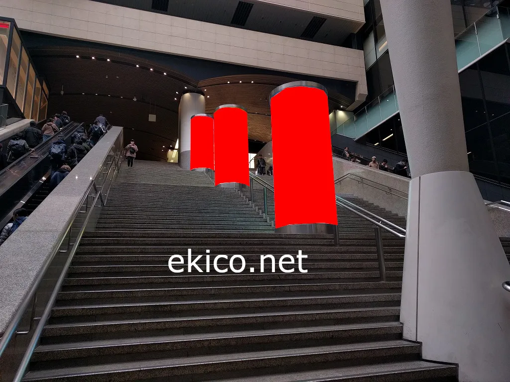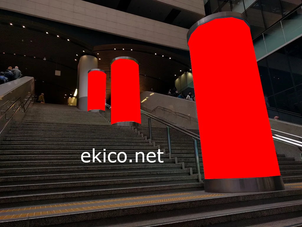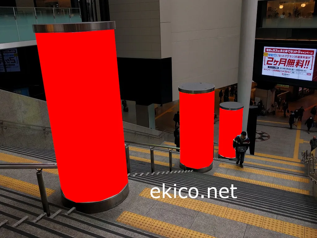 大階段の中央に設置された電照式円柱3基セットでインパクトのある媒体です。
