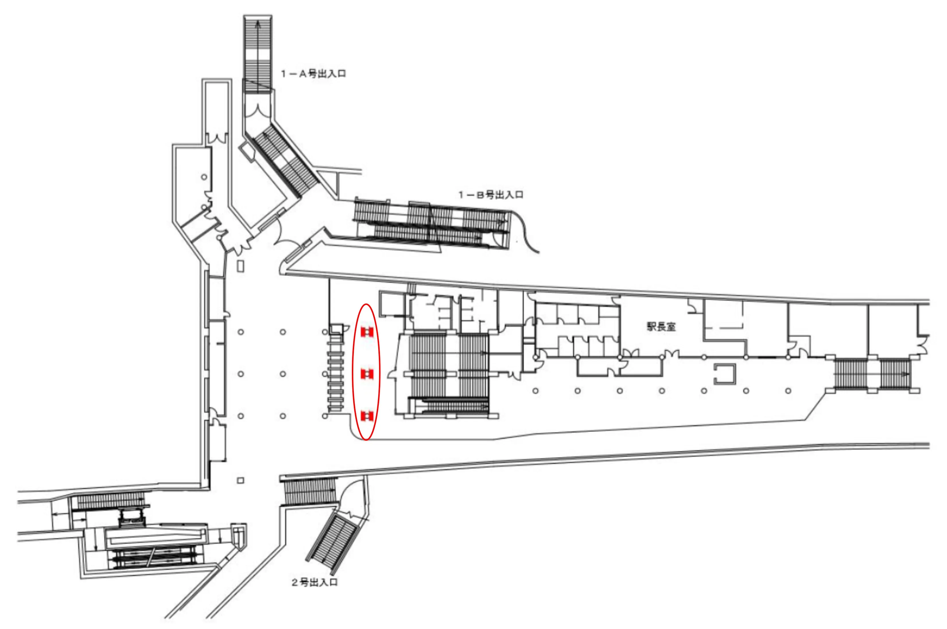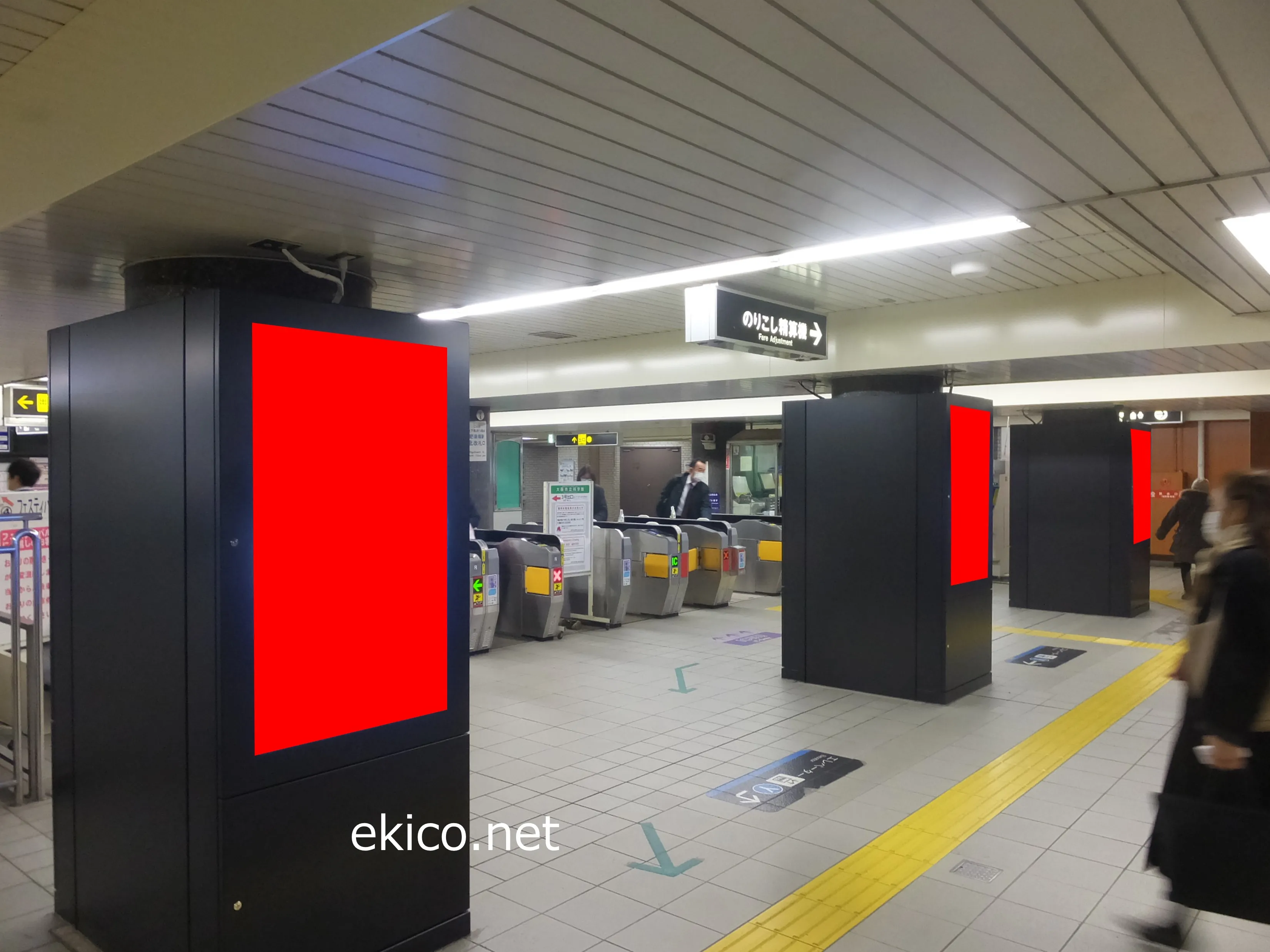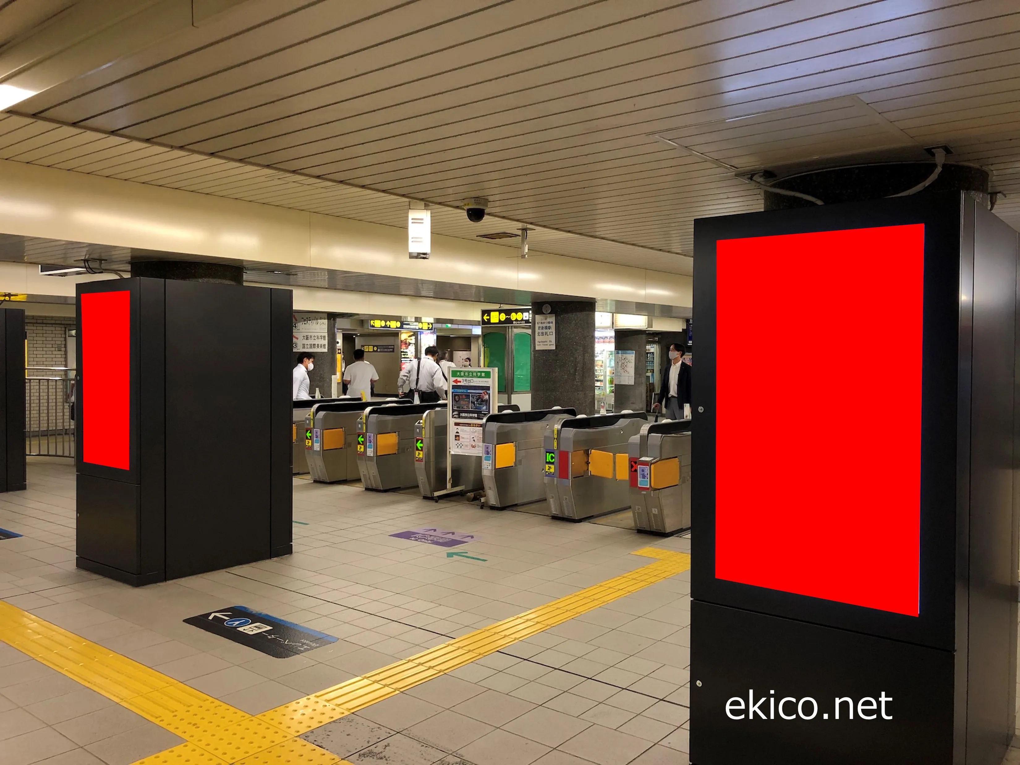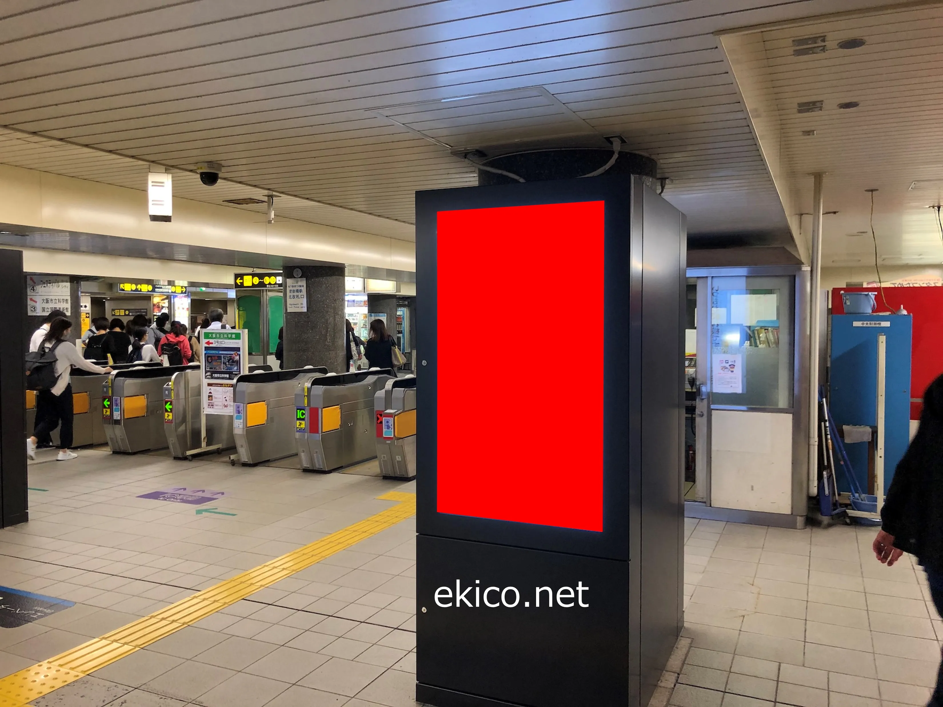 北改札付近に設置されています。肥後橋駅周辺はオフィス街のため、通勤時間は非常に利用者が多い駅です。日中も多くのビジネスパーソンが利用するため活気があります。