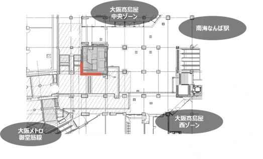 なんばエリアをつなぐエントランスゾーンに設置されており、Osaka Metro・近鉄線・阪神線に接続しています。