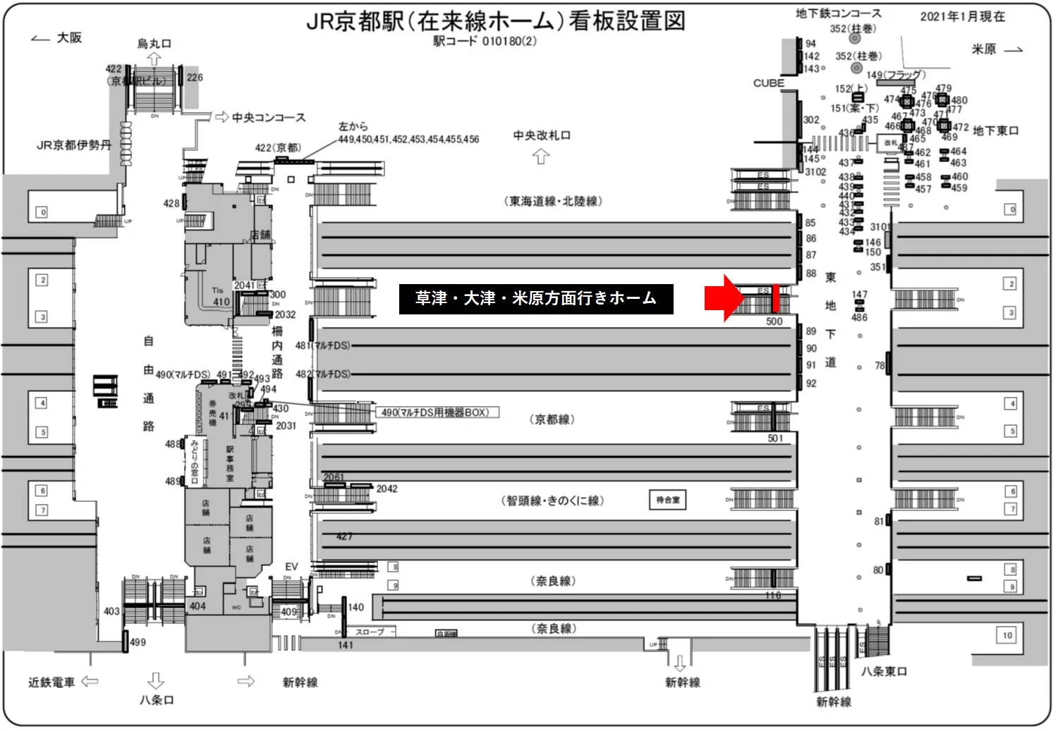 琵琶湖・湖西線のホームから、地下の改札に降りる階段に設置されています。京都の各地への利用者、新幹線や京都地下鉄の乗り換える人がターゲットになります。