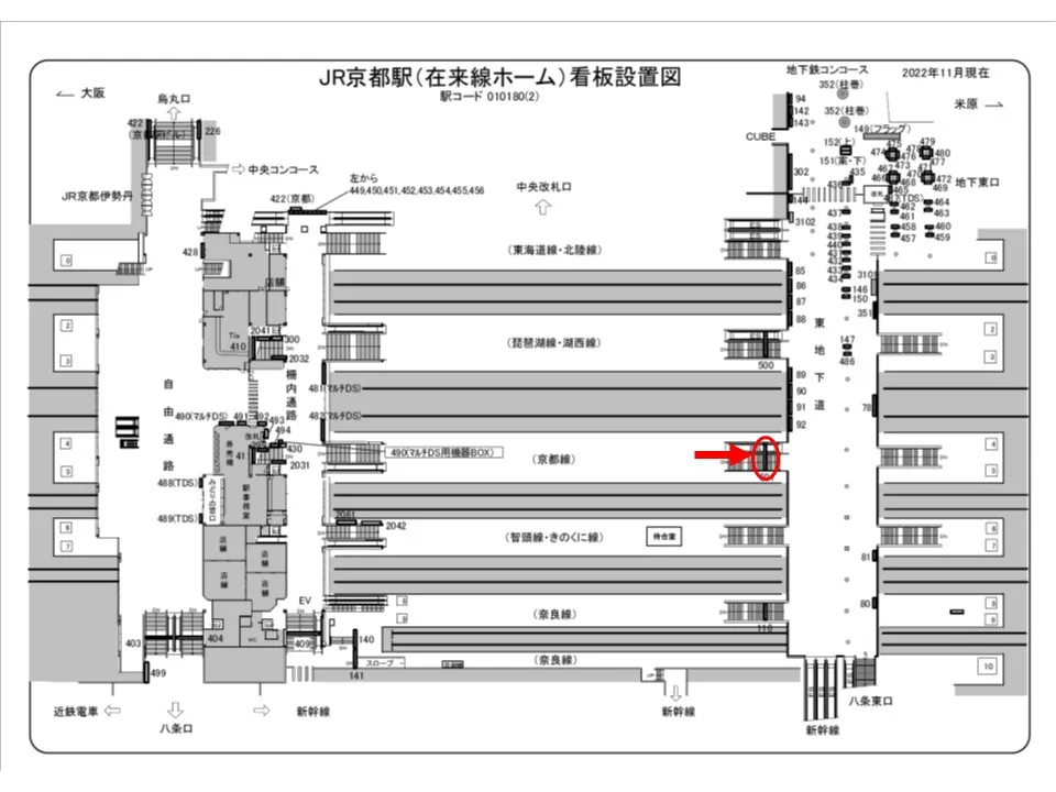 京都線のホームから、地下の改札に降りる階段に設置されています。京都の各地への利用者、新幹線や京都地下鉄の乗り換える人がターゲットになります。