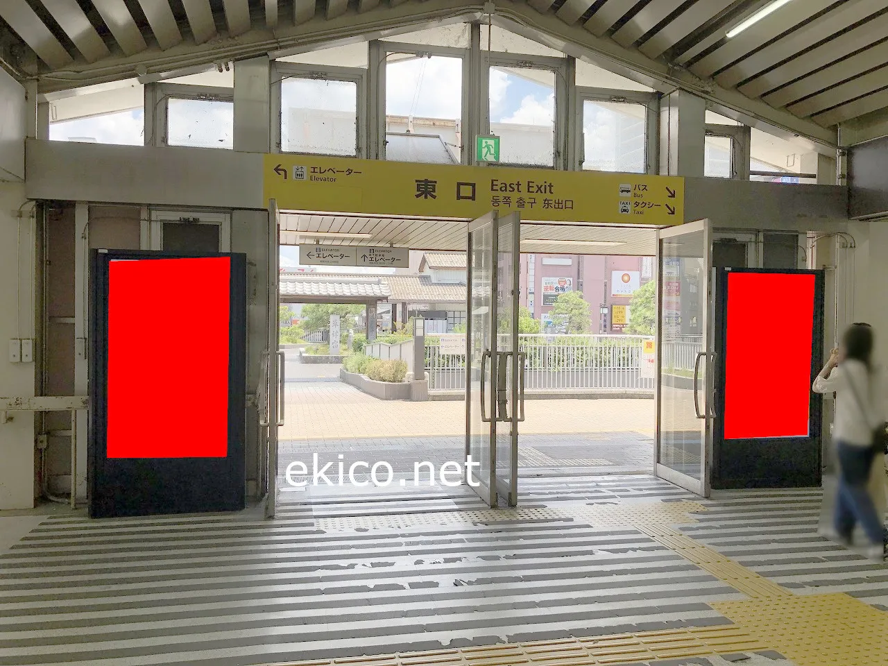 草津駅メイン流動路である東口歩道橋へのアクセスに面した位置にデジタルサイネージを掲出。2面セットですので、視認性も良好です。