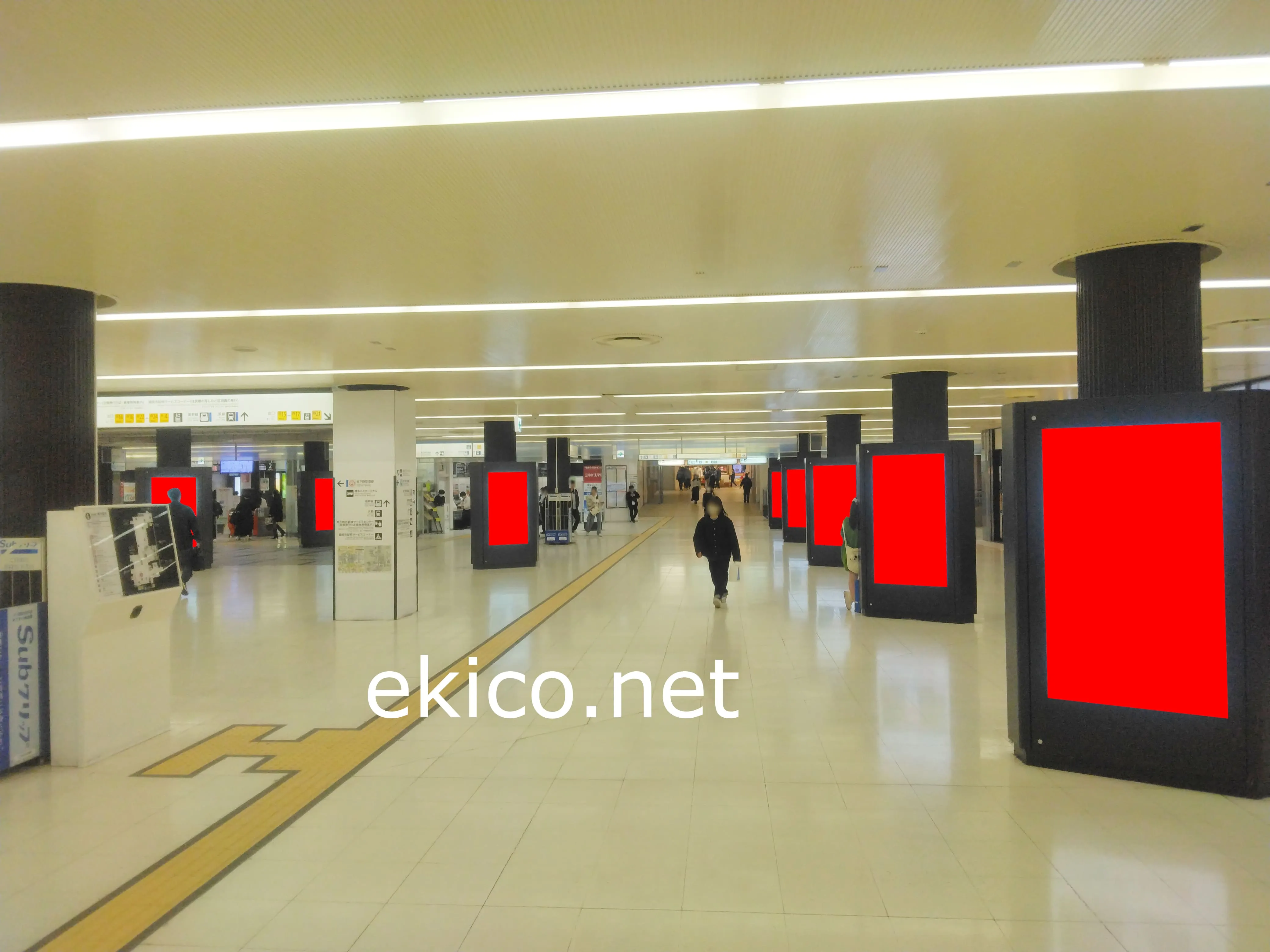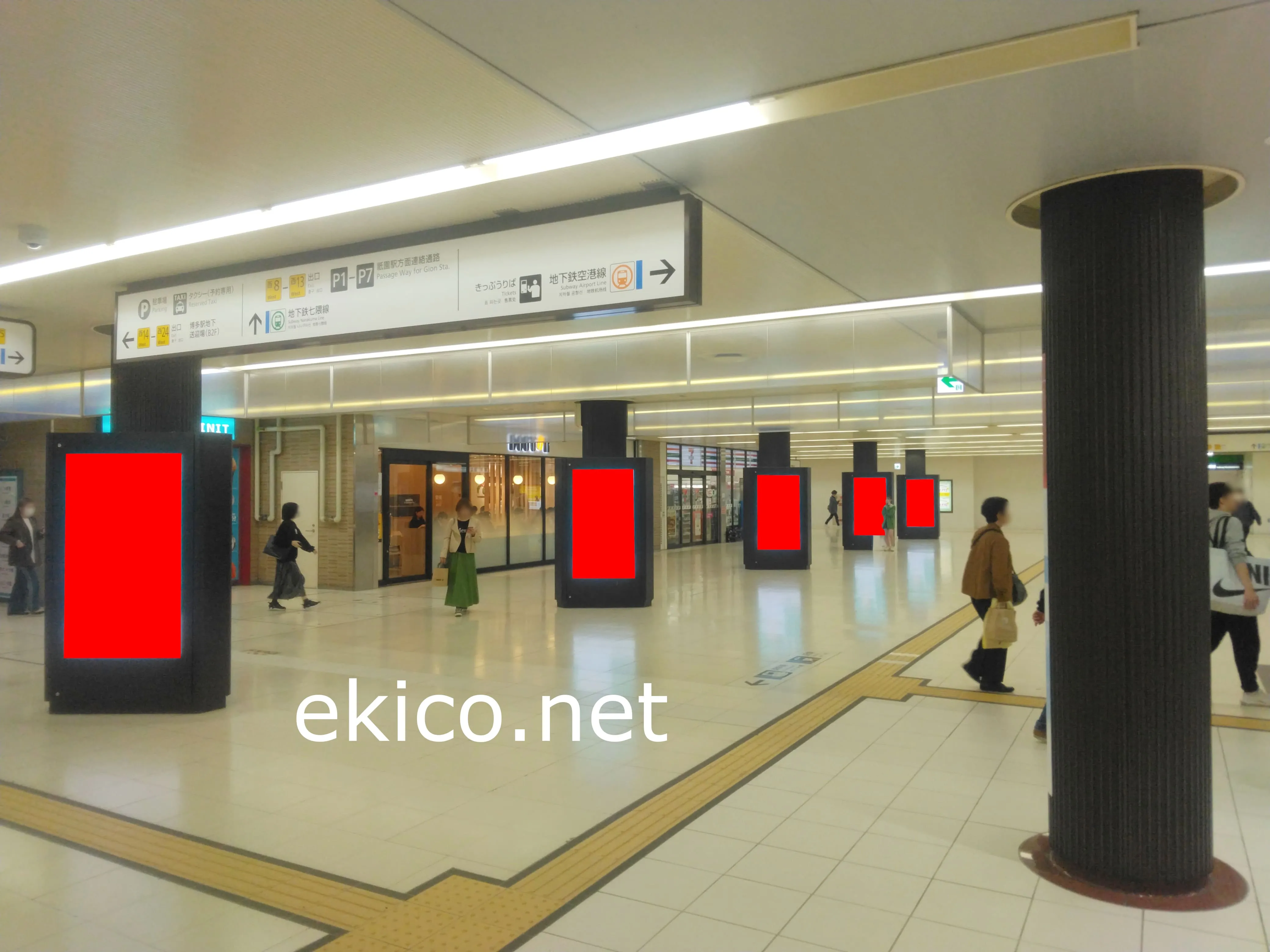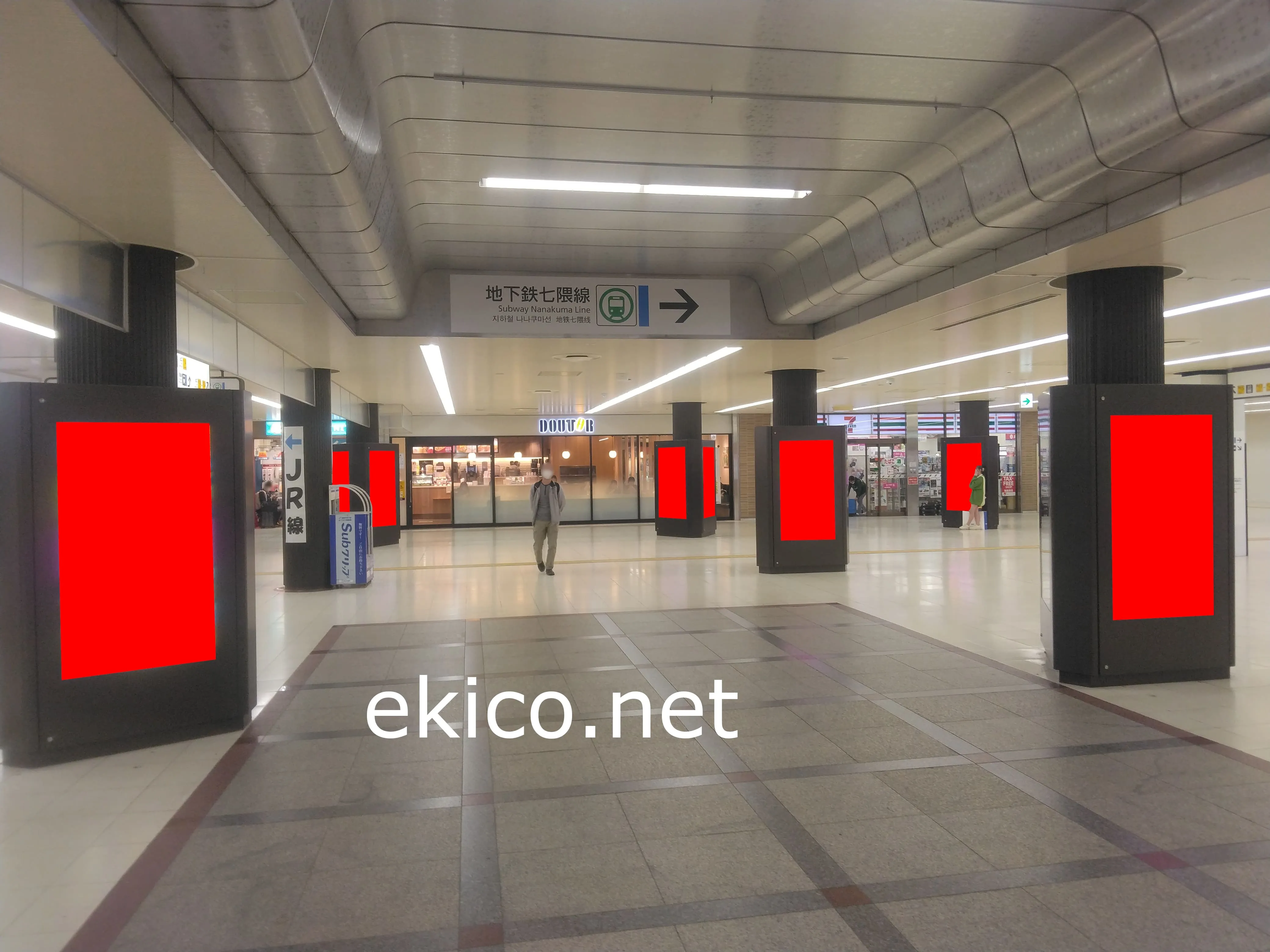 福岡地下鉄の博多駅(博多口)の駅コンコースに設置された駅デジタルサイネージ広告です。8柱15面で集中掲出感のある広告です。