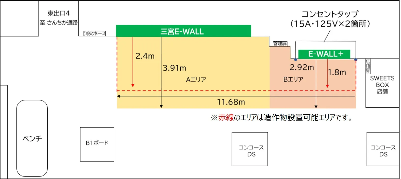 | サイズ | ・E-WALL:H2,066×W6,868㎜ ・E-WALL+:H2,070×W2,920㎜ ・イベントエリア:約41.4㎡(A+B) Aエリア:29.2㎡ Bエリア:12.2㎡ |