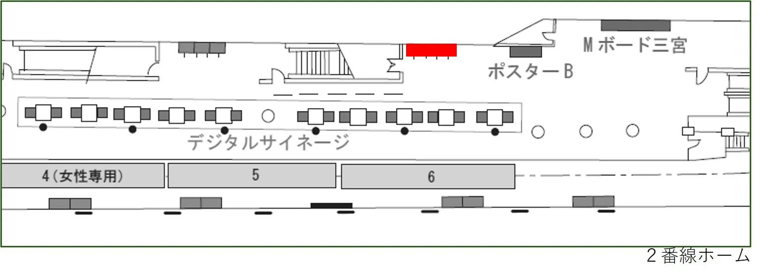 三宮駅の2番線ホーム壁面に位置するフレームレス、ファブリック広告です。ファブリック特有の色鮮やかな広告表現が特徴です。東改札導線に沿ってホームベンチ上に位置し、新神戸からのビジネス層や西神中央方面に電車を待つお客様へもアピールが可能です。