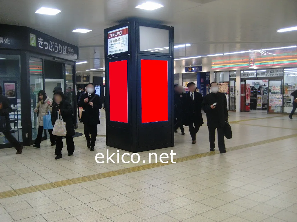 改札外コンコースの1柱にデジタルサイネージ3面を掲出されます。改札前に掲出出されるため乗降客の目に当たる可能性が高い媒体です。