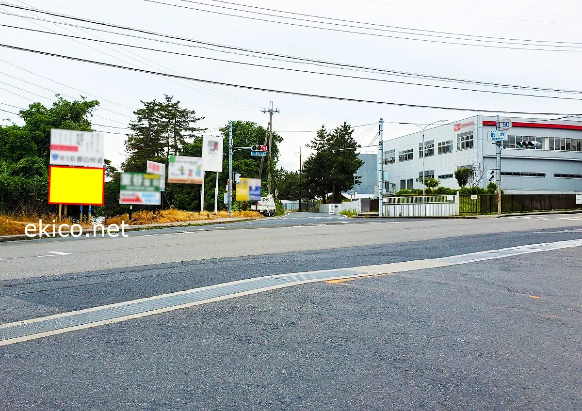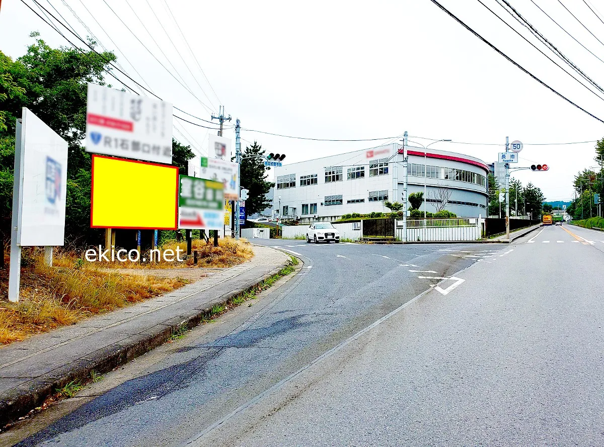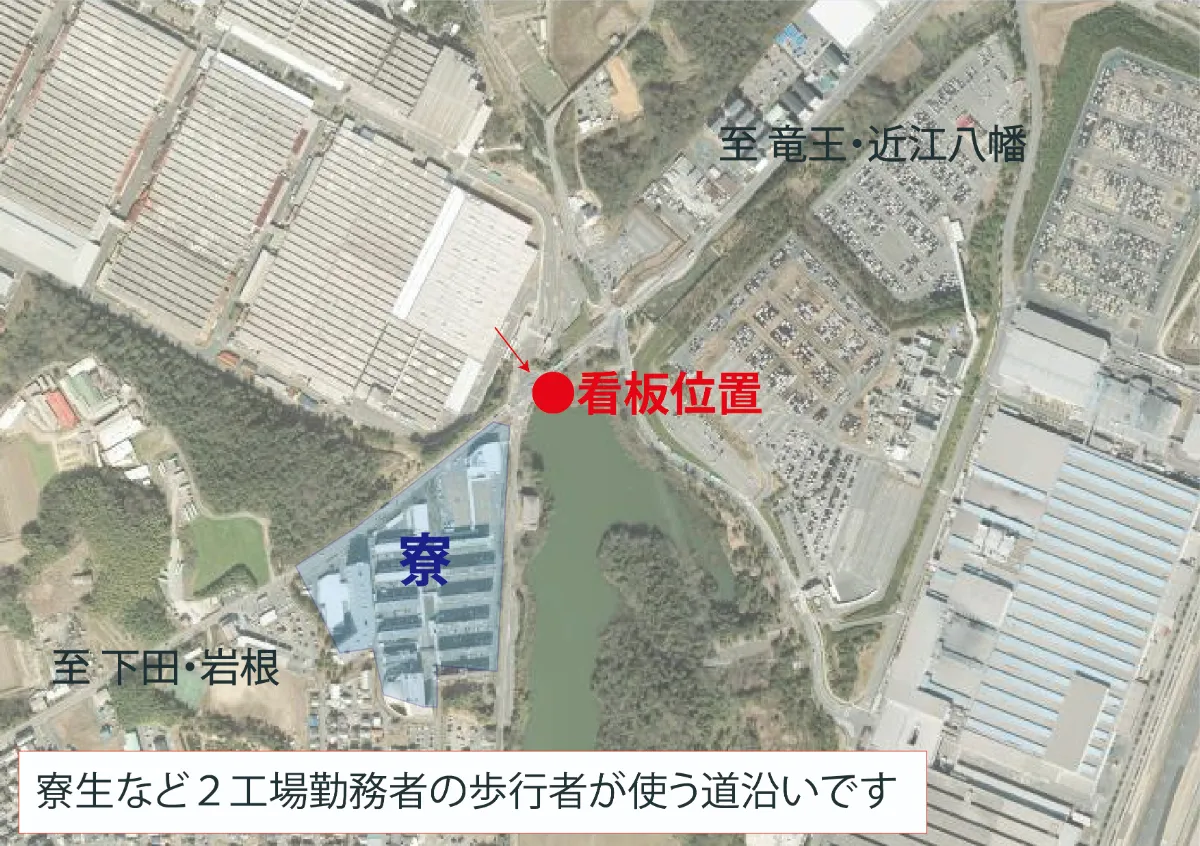 滋賀県蒲生郡竜王町の長池交差点付近に位置する看板広告です。付近にはダイハツの工場が多く並ぶため、車通勤者はもちろん寮生など工場勤務の歩行者も対象となります。