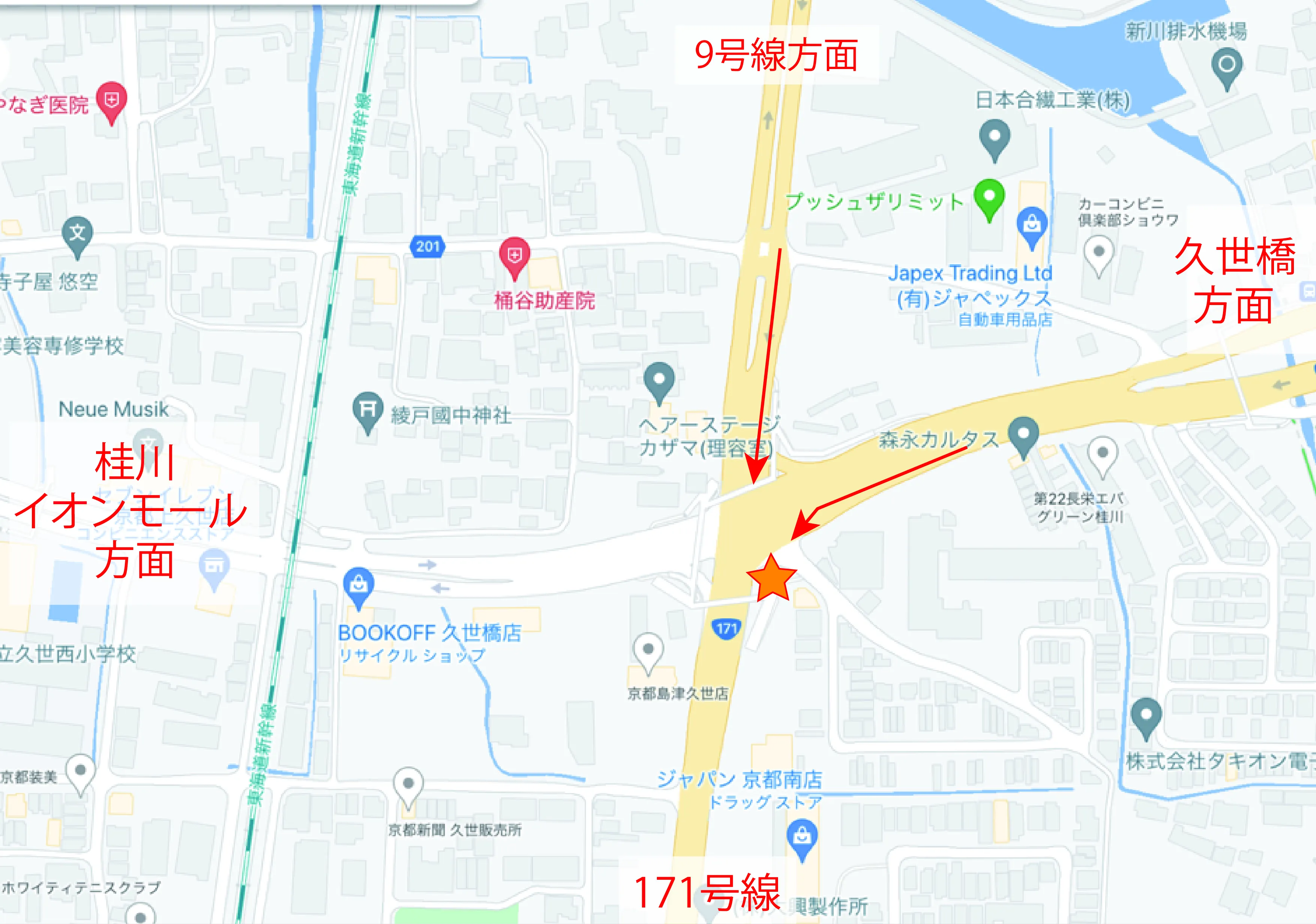 国道9号線方面から下る車、桂川イオンモールから東に向かう車の2方面から大きく見える看板となります。